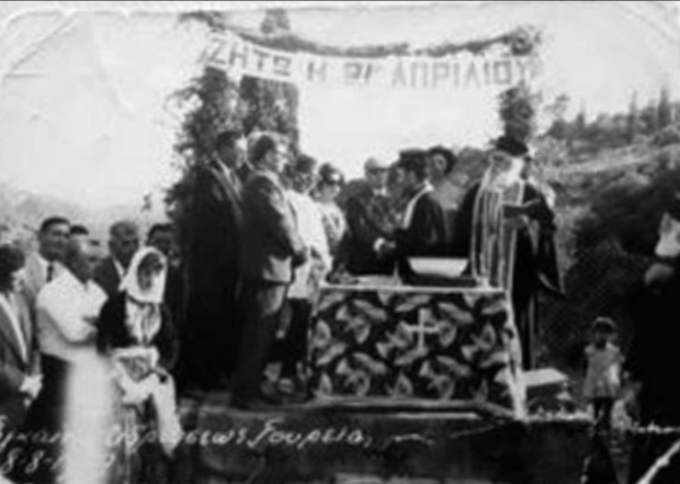 Εδώ στη φωτογραφία φαίνονται δύο ιερείς, ο παπά Ηλίας Χανιώτης κι ο παπά Γιάννης Λευθέρης-Μπουρνάζος. Σύμφωνα με όσα μάς είπαν ήταν εκεί ο πρόεδρος της Κοινότητος Λογοθετιανίκων Σωτήριος Κομηνός, ενώ η κοπέλα με την τοπική ενδυμασία είναι η Ουρανία Μπατσινίλα. Πίσω της στην εξέδρα ο πρόεδρος στα Φριλιγκιάνικα Π. Τσιτσίλιος, ενώ είναι και ο πρόεδρος του Καραβά Μ. Σουρής (Σκλάβος), ο Τριαντάφυλλος Κορωναίος (Βασιλιόπουλος) κ.α.