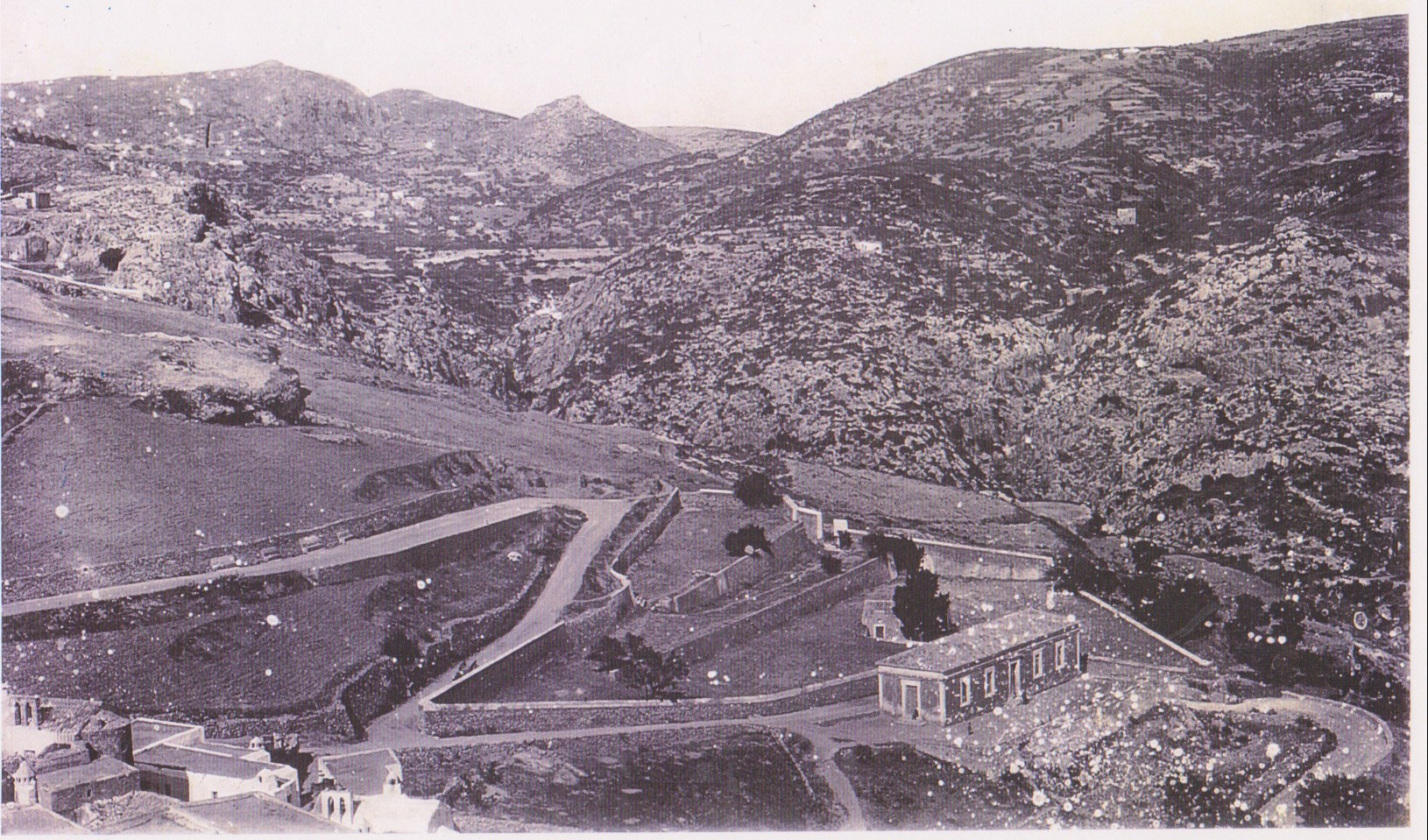 Στην εκπληκτική αυτή φωτογραφία διακρίνουμε το παλιό Δημοτικό Σχολείο στη Χώρα και πίσω από αυτό το ναό της Αγίας Αναστασίας. Μόλις διακρίνεται το κωδωνοστάσιο της Αγίας Βαρβάρας και μερικά από τα σπίτια στο Μέσα Βούργο, ενώ ο δρόμος στο Μπελβεντέρε είναι φυσικά ο παλιότερος δρόμος και γύρω τα χωράφια, τα οποία τότε καλλιεργούνταν όλα. Φυσικά ούτε ο Μετεωρολογικός Σταθμός έχει ανεγερθεί, ούτε τα σπίτια εκεί κοντά. Αξιοπερίεργο ότι, τόσο σε πρώτο πλάνο, όσο και λίγο πιο μακριά διακρίνεται ελάχιστη ή αραιή βλάστηση. Σε μία εποχή που οι βροχές ήταν πολλές δεν υπάρχουν δένδρα και θάμνοι. Ο λόγος βέβαια είναι ότι οι κάτοικοι δεν άφηναν ανεκμετάλλευτο ούτε εκατοστό γης για να ζήσουν. Παρατηρείστε ότι ο ελαιώνας που υπάρχει σήμερα πάνω από το Δημοτικό Σχολείο τότε δεν υπάρχει και έχουμε απλά ένα σκέτο χωράφι.