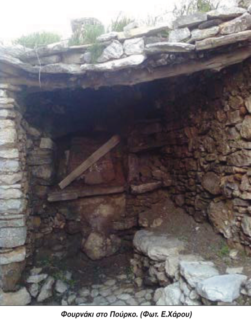 Ο πόρος του φούρνου, δηλ. το άνοιγμα έπρεπε να είναι όσο γίνεται πιο μικρό. Ήταν ένα Π που αρχικά γινόταν με πωριά, αργότερα με σίδερο. Μπροστά στον πόρο έφτιαχναν το λακκόφουρνο, ένα λάκκο όπου τραβούσαν τα κάρβουνα με μια σιδερένια βέργα. Η ρούτα ήταν ένα πανί βρεγμένο με το οποίο καθαρίζανε το φούρνο για να τοποθετήσουν τα ψωμιά πολλές φορές απ’ ευθείας στον πατόφουρνο. Για να κάψουν το φούρνο χρησιμοποιούσαν κυρίως πρίνους και ασπαλάθους, αλλά και σπάρτους που έκαναν σμπάρα και λιόκλαδα.