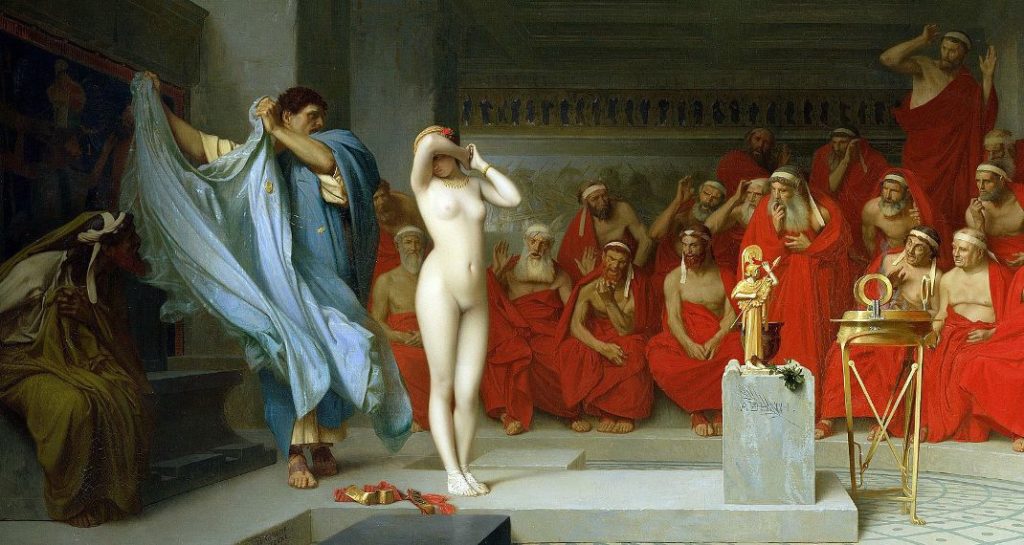 Ο ρήτορας Υπερείδης που την υπερασπίζεται στη δίκη, έχει μόλις τραβήξει από πάνω της τον γαλάζιο μανδύα που φορούσε. Μηχανεύτηκε αυτό το κόλπο για να δουν τη φυσική της ομορφιά οι δικαστές και να τη λυπηθούν.