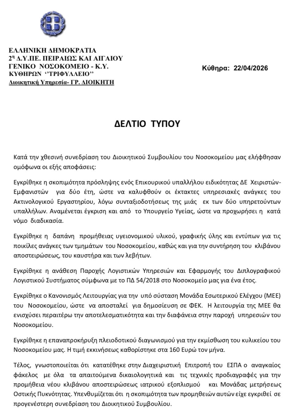 AdvertisementΑνακοινώσεις _ Δελτία Τύπου Γ.Ν.-Κ.Υ. Κυθήρων «Τριφύλλειο» – Δελτίο Τύπου την Απρ 24, 2026 23