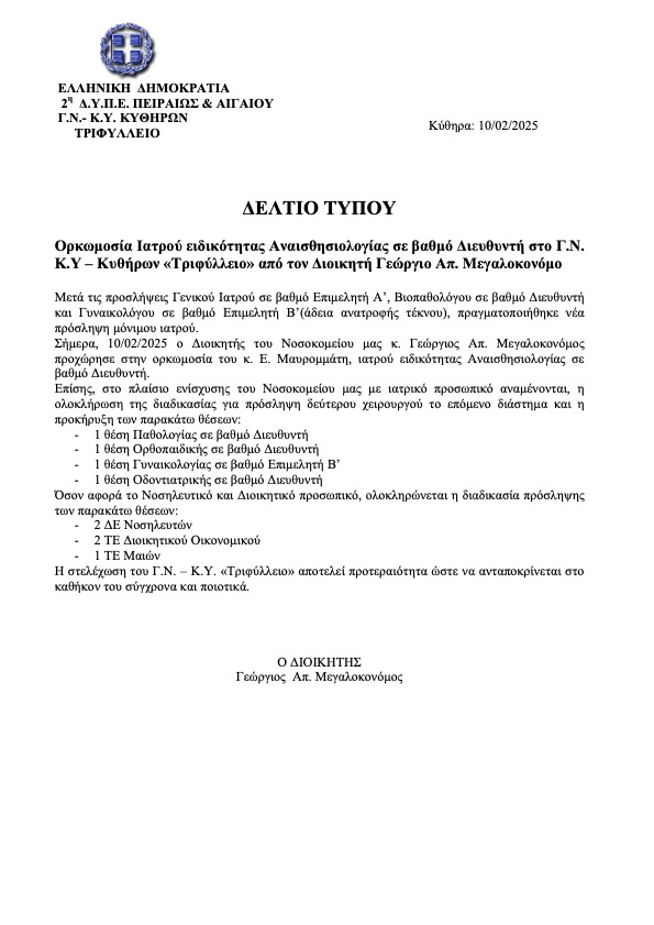 Γ.Ν.- Κ.Υ. ΚΥΘΗΡΩΝ ΤΡΙΦΥΛΛΕΙΟ | ΔΕΛΤΙΟ ΤΥΠΟΥ – Ορκωμοσία Ιατρού ειδικότητας Αναισθησιολογίας σε βαθμό Διευθυντή από τον Διοικητή Γεώργιο Απ. Μεγαλοκονόμο