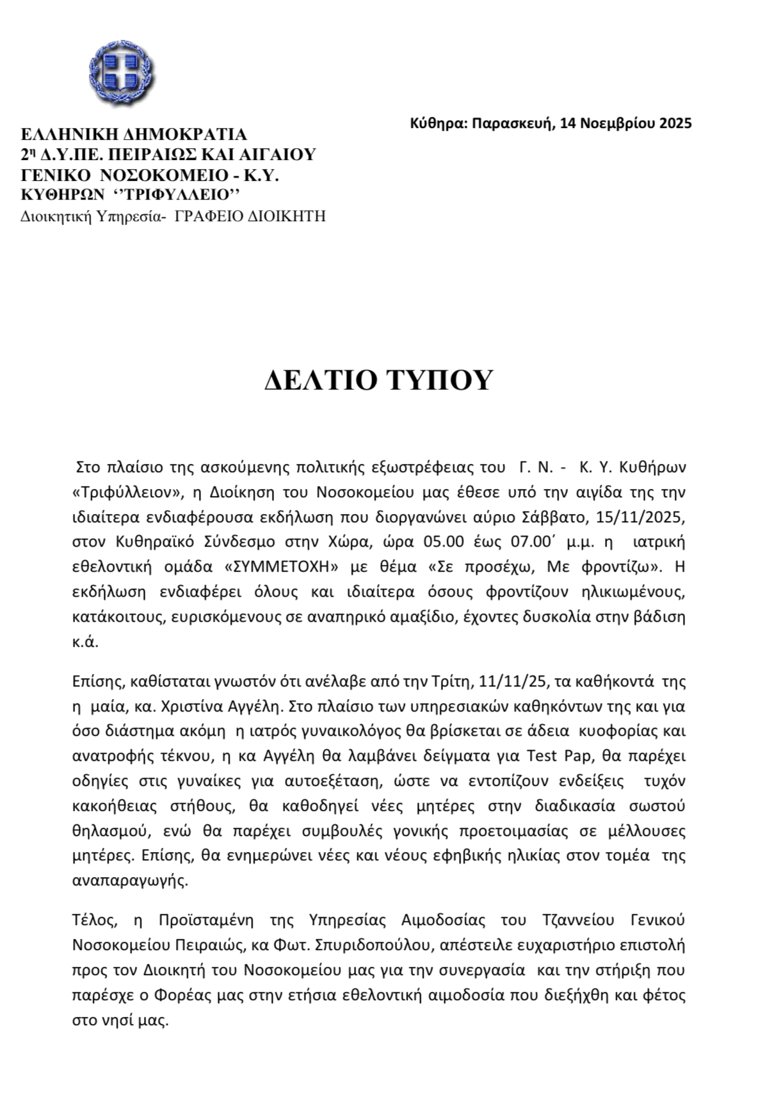 - Γεν. Νοσοκομείο Κυθήρων – 14-11-25 ΔΕΛΤΙΟ ΤΥΠΟΥ