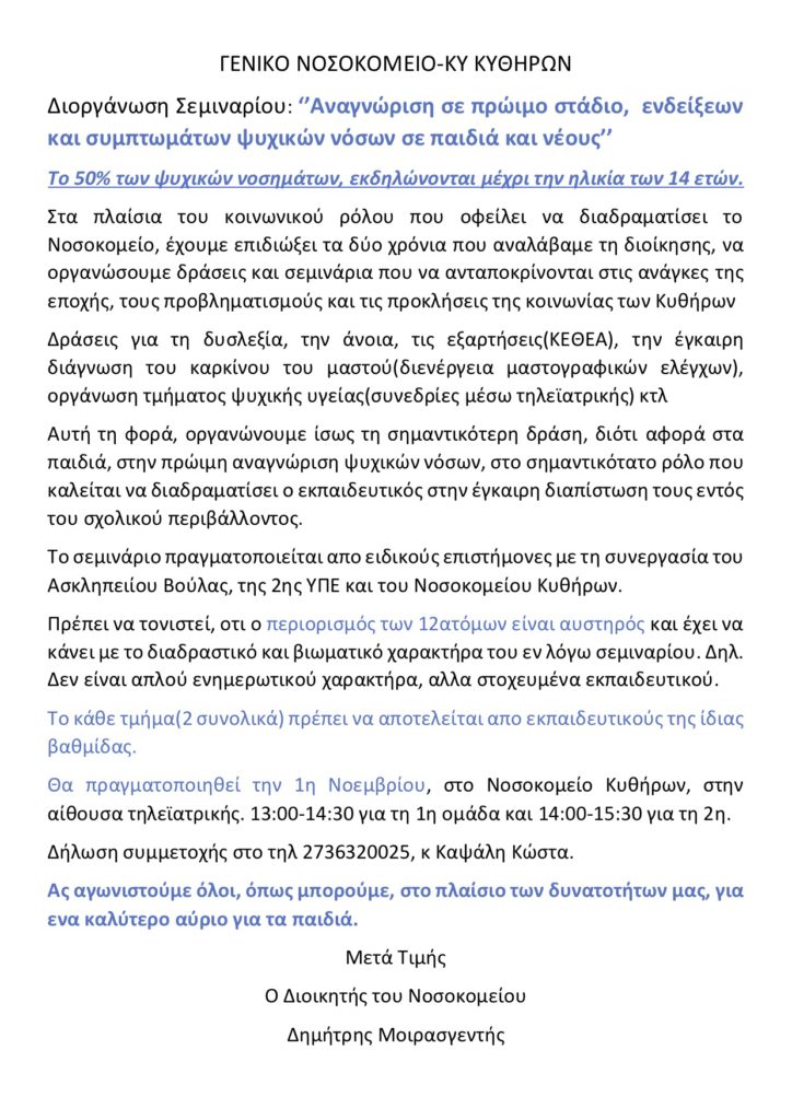 Γενικό Νοσοκομείο Κυθήρων – Διοργάνωση σεμιναρίου: “Αναγνώριση σε πρώιμο στάδιο, ενδείξεων και συμπτωμάτων ψυχικών νόσων σε παιδιά και νέους”