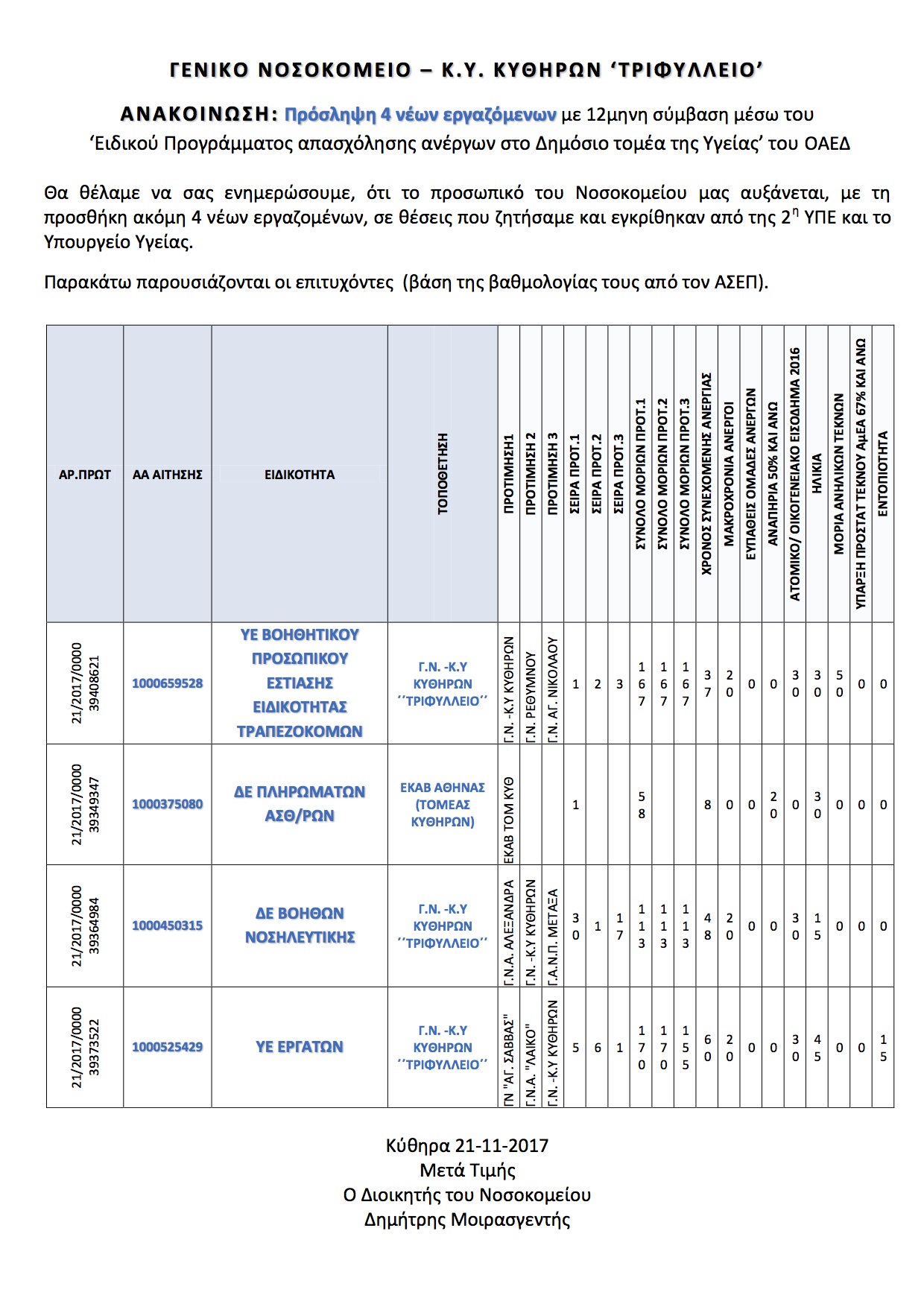 - Γενικό Νοσοκομείο – Κ.Υ. Κυθήρων “Τριφύλλειο” – Πρόσληψη 4 νέων εργαζόμενων