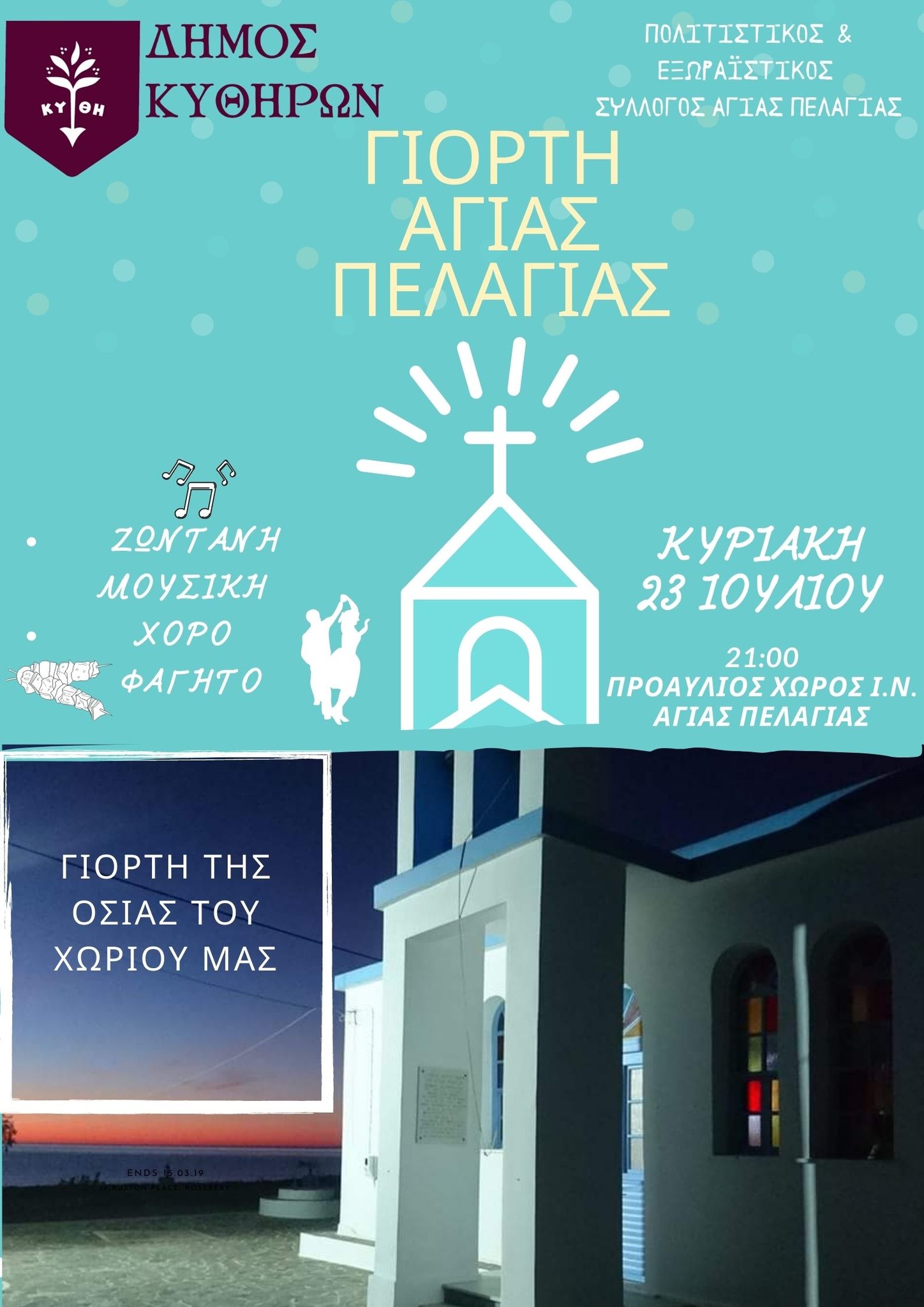 Ο Σύλλογος μας σας προσκαλεί στη Γιορτή της Εκκλησίας μας ” Αγίας Πελαγίας” την Κυριακή 23 Ιουλίου και ώρα 09:00 μ.μ που θα γίνει στο προαύλιο χώρο του Ι.Ν με πολύ κέφι , Ζωντανή μουσική, Χορό και φαγητό!