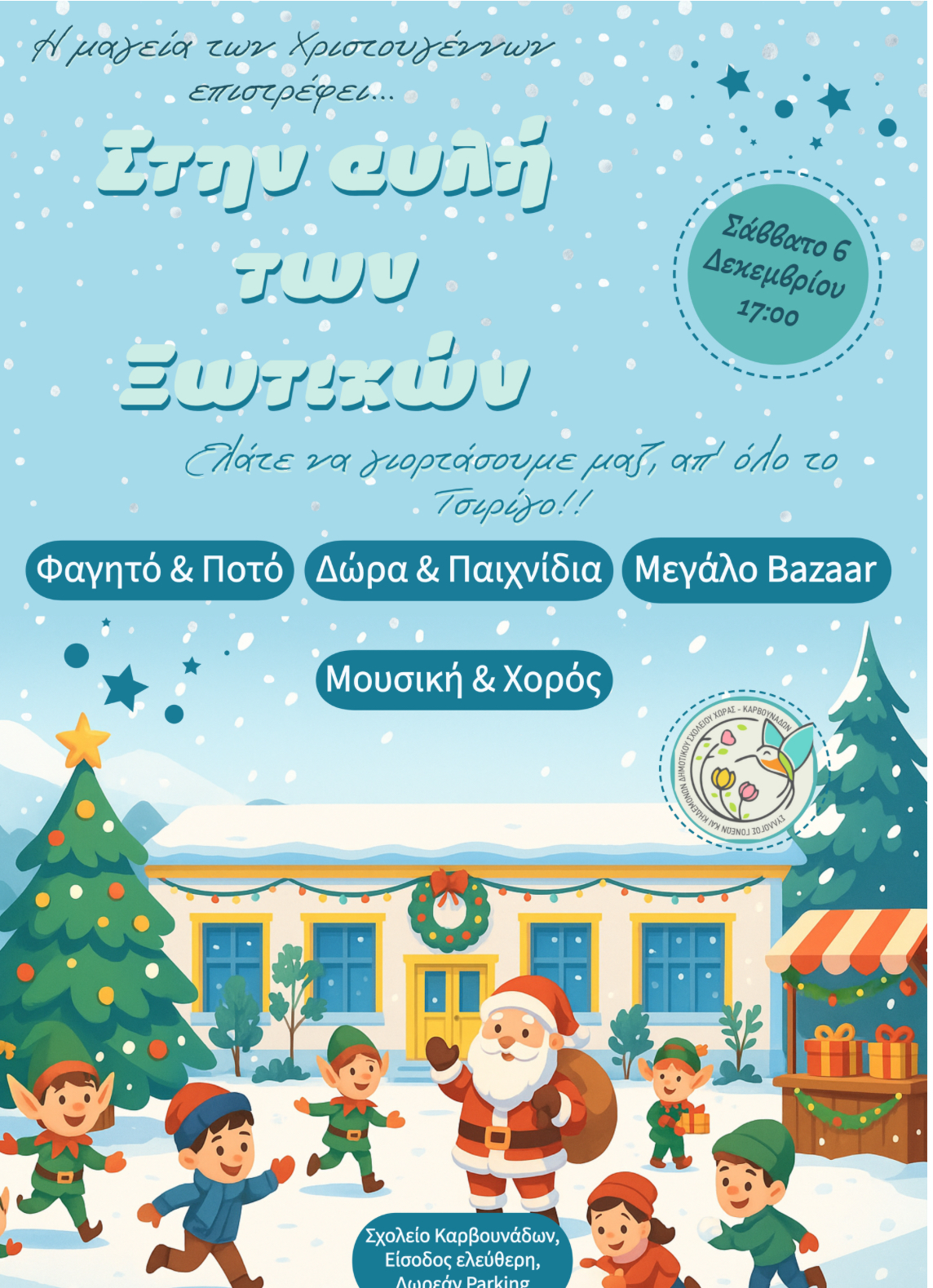 Με μεγάλη χαρά σας ανακοινώνουμε ότι στις 6 Δεκεμβρίου ημέρα Σάββατο καιρού επιτρέποντος, θα πραγματοποιηθεί η χριστουγεννιάτικη γιορτή και το παζάρι του Συλλόγου Γονέων και Κηδεμόνων του Δημοτικού Σχολείου Χώρας – Καρβουνάδων.