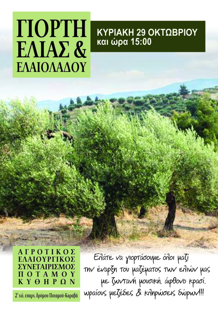 - Γιορτή ελιάς & ελαιολάδου στον Ποταμό την Κυριακή 29 Οκτωβρίου στις 15.00