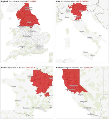 Πριν τη ρωσική εισβολή στα τέλη Φεβρουαρίου του 2022 στις περιοχές αυτές ζούσαν περίπου 11 εκατομμύρια Ουκρανοί. Και για να αντιληφθεί κανείς το μέγεθος, η βρετανική εφημερίδα απεικόνισε σε χάρτες συγκρίσιμες κατοικημένες περιοχές στη Γαλλία, τη Βρετανία και την Ιταλία και στην Καλιφόρνια . Οι σκιασμένες περιοχές στους χάρτες αντιπροσωπεύουν ανάλογους πληθυσμούς στις τέσσερις χώρες.
