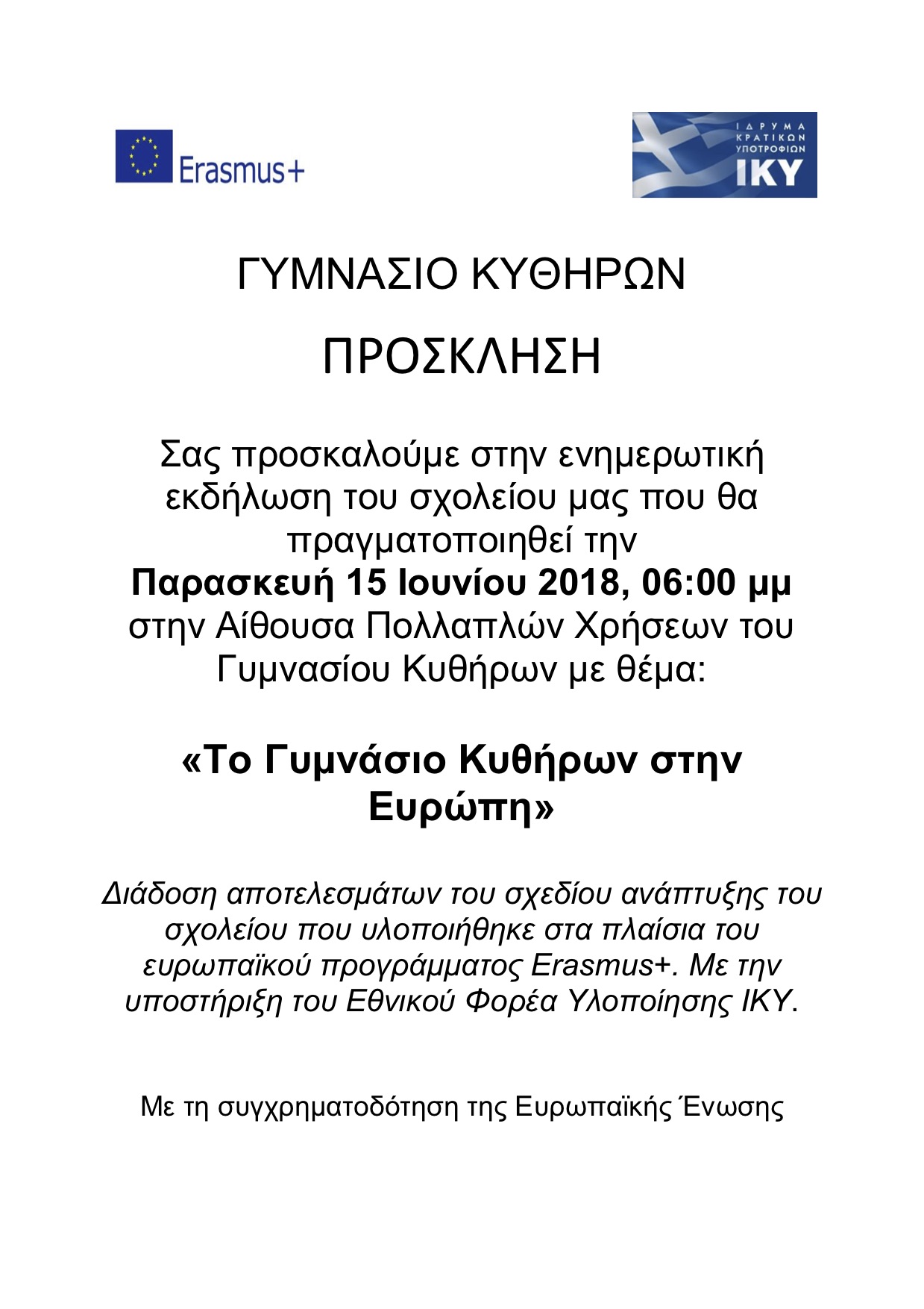 Γυμνάσιο Κυθήρων – Πρόσκληση σε ενημερωτική εκδήλωση Διάδοσης Αποτελεσμάτων Erasmus+