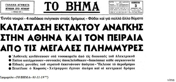 2 Νοεμβρίου 1977, 37 νεκροί. Βροχόπτωση μεγάλης έντασης επί μιάμιση ώρα πλήττει το κέντρο της Αθήνας αλλά και πολλές περιοχές στον Πειραιά που κηρύσσονται σε κατάσταση έκτακτης ανάγκης. Πλημμύρισαν περισσότερα από 1.900 υπόγεια, σπίτια και καταστήματα, 172 οχήματα παρασύρθηκαν ενώ οι καταστροφές στους δρόμους ήταν τεράστιες.