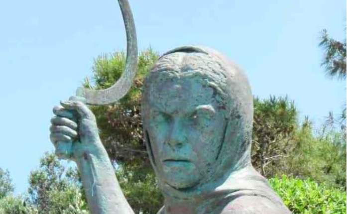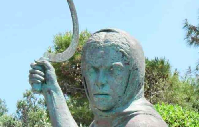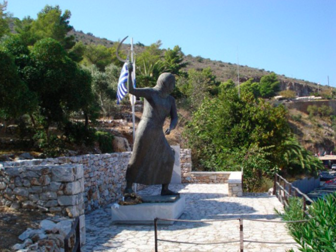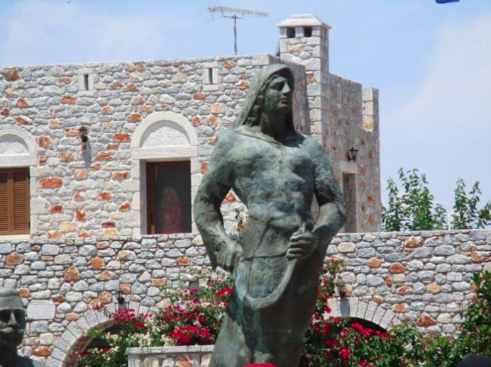 Στην καρδιά της Μάνης λοιπόν, στο δρόμο για το «τουριστάδικο» σπήλαιο, μερικά μέτρα πριν ένα μεγάλο άγαλμα που ξεπροβάλλει μέσα από θάμνους και ελιές προκαλεί ερωτηματικά.