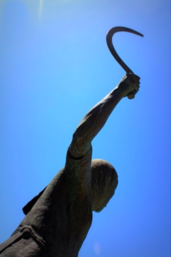 Είναι η κλασσική φιγούρα της κυράς του χωριού, που είναι τόσο γνώριμη σε όλους μας, αυτής με τη μαντήλα, το φακιόλι, στο κεφάλι, με το μακρύ μέχρι τις πατούσες των ποδιών φόρεμα. Φιγούρα αγριεμένη, με βαθιές σκαμμένες ρυτίδες στο πρόσωπο που κραδαίνει απειλητικά ένα μεγάλο δρεπάνι…