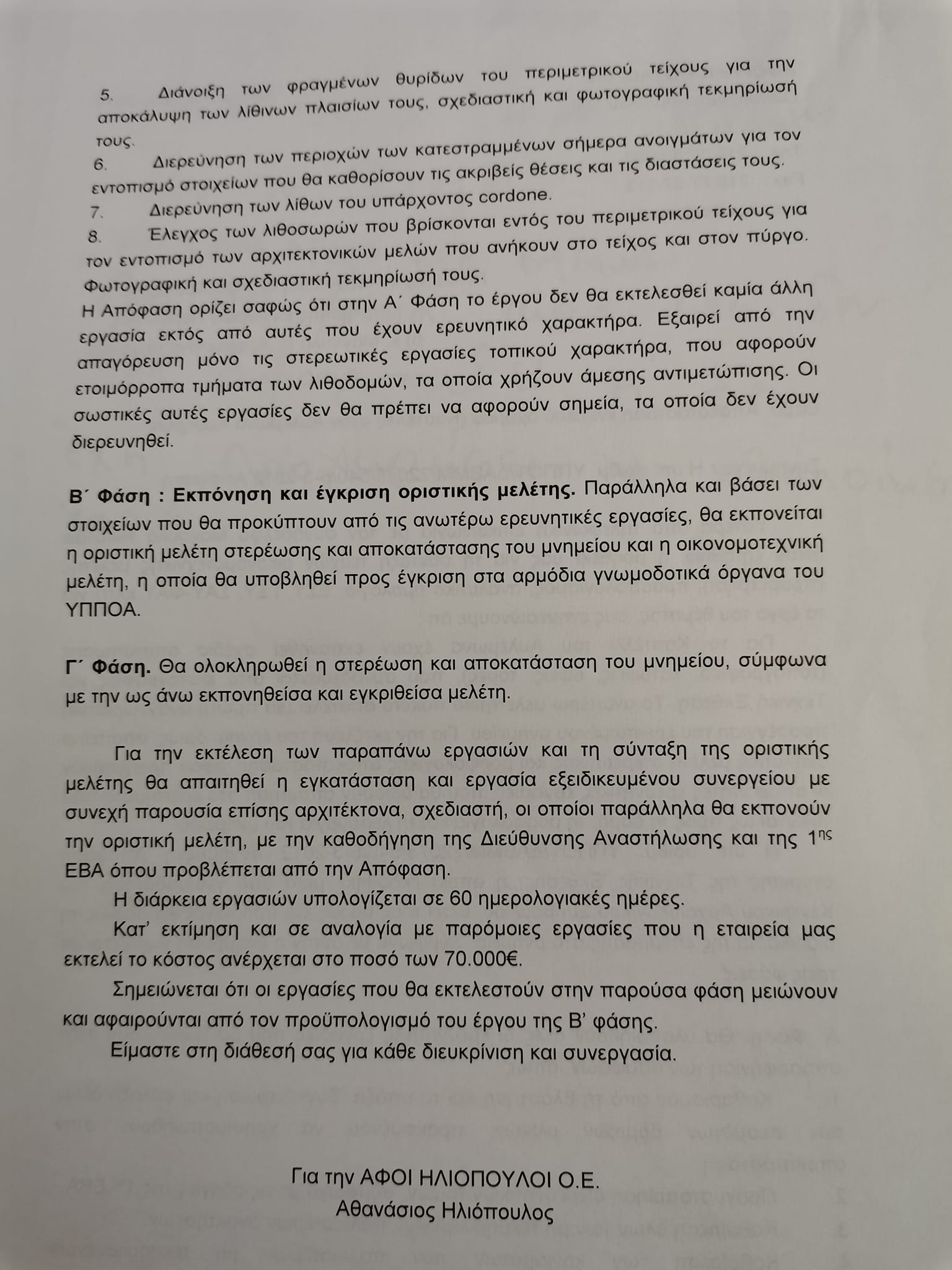 Πάμε παρακάτω. Το 2014, το Τεχνικό Γραφείο «ΑΦΟΙ ΗΛΙΟΠΟΥΛΟΙ ΟΕ» που είχαν αναλάβει εκ μέρους της Εγχωρίου Περιουσίας την αναστήλωση του εξωτερικού τοίχους του Κάστρου της Παλαιόχωρας, έστειλε επιστολή στην Εγχώριο επιβεβαιώνοντας πλήρως τα ανωτέρω. Εκτίμησε, δε, το κόστος της πρώτης φάσης (διερευνητική) σε 70.000€.