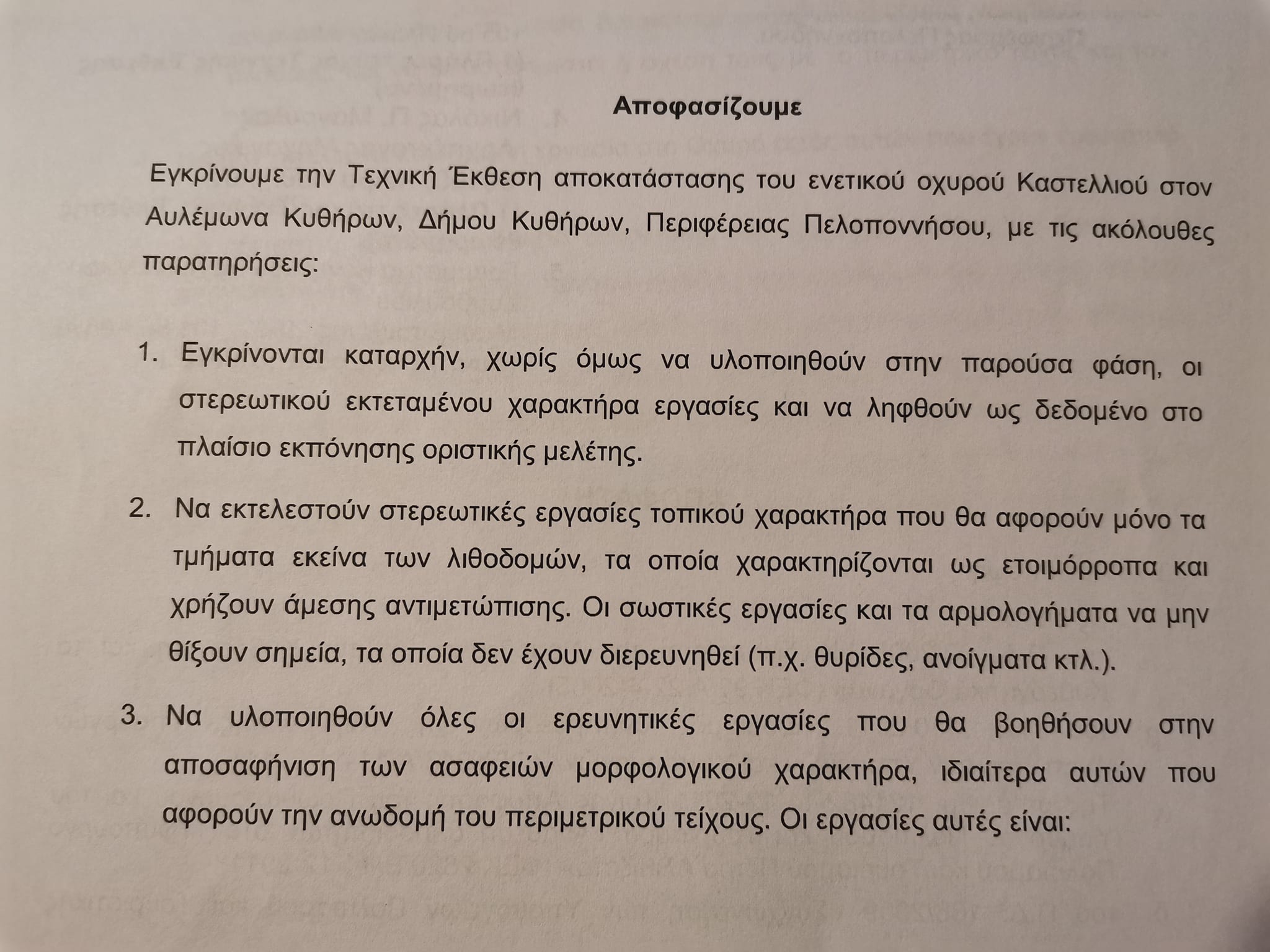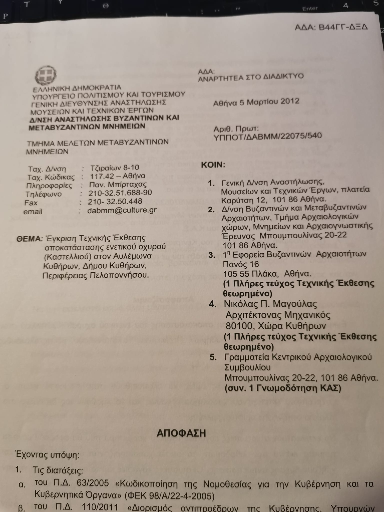 Στις 5 Μαρτίου 2012, με απόφαση του τότε Υφυπουργού Πολιτισμού Πέτρου Αλεβιζάτου εγκρίθηκε, κατόπιν σύμφωνης γνώμης του ΚΑΣ, η «Τεχνική Έκθεση αποκατάστασης ενετικού οχυρού (Καστελλιού) στον Αυλέμωνα Κυθήρων». Η σχετική απόφαση αναρτήθηκε στη Διαύγεια με ΑΔΑ: Β44ΓΓ-ΔΞΔ. Προφανώς ο κ. Μαγουλάς αναφέρεται σε αυτήν την απόφαση, αλλά αποκρύπτει τεχνηέντως το περιεχόμενό της. Διότι η απόφαση αυτή ΔΕΝ εγκρίνει την πλήρη και συνολική αποκατάσταση του μνημείου αλλά την 1η από τις 3 συνολικά φάσεις. Συγκεκριμένα αναφέρεται σε έγκριση Τεχνικής Έκθεσης και όχι οριστικής μελέτης. Ορίζει ότι οι «στερεωτικού χαρακτήρα εκτεταμένες εργασίες εγκρίνονται καταρχήν χωρίς όμως να υλοποιηθούν στην παρούσα φάση» διότι η οριστική μελέτη επρόκειτο να εκπονηθεί αργότερα. Με την απόφαση αυτή εγκρίνεται ουσιαστικά η ερευνητική εργασία που τίθεται ως προϋπόθεση για την εκπόνηση της οριστικής μελέτης και συγκεκριμένα: καθαρισμός βλάστησης, διερευνητικές τομές, διάνοιξη φραγμένων θυρίδων, εντοπισμός, τεκμηρίωση, σχεδίαση και φωτογράφηση των αρχιτεκτονικών μελών που βρίσκονται διάσπαρτοι εντός και εκτός του Κάστρου κ.λπ. Με σαφήνεια ορίζει η απόφαση: «Να μην εκτελεστεί καμία άλλη εργασία στο Οχυρό εκτός αυτών που έχουν ερευνητικό χαρακτήρα»! ΑΡΑ ΜΕΛΕΤΗ ΑΠΟΚΑΤΑΣΤΑΣΗΣ ΚΑΙ ΑΝΑΔΕΙΞΗΣ ΔΕΝ ΥΠΑΡΧΕΙ ΔΙΟΤΙ ΑΠΑΙΤΕΙΤΑΙ ΠΡΩΤΑ Η ΠΡΑΓΜΑΤΟΠΟΙΗΣΗ ΕΡΕΥΝΗΤΙΚΩΝ ΕΡΓΑΣΙΩΝ ΓΙΑ ΤΗΝ ΕΚΠΟΝΗΣΗ ΤΗΣ!