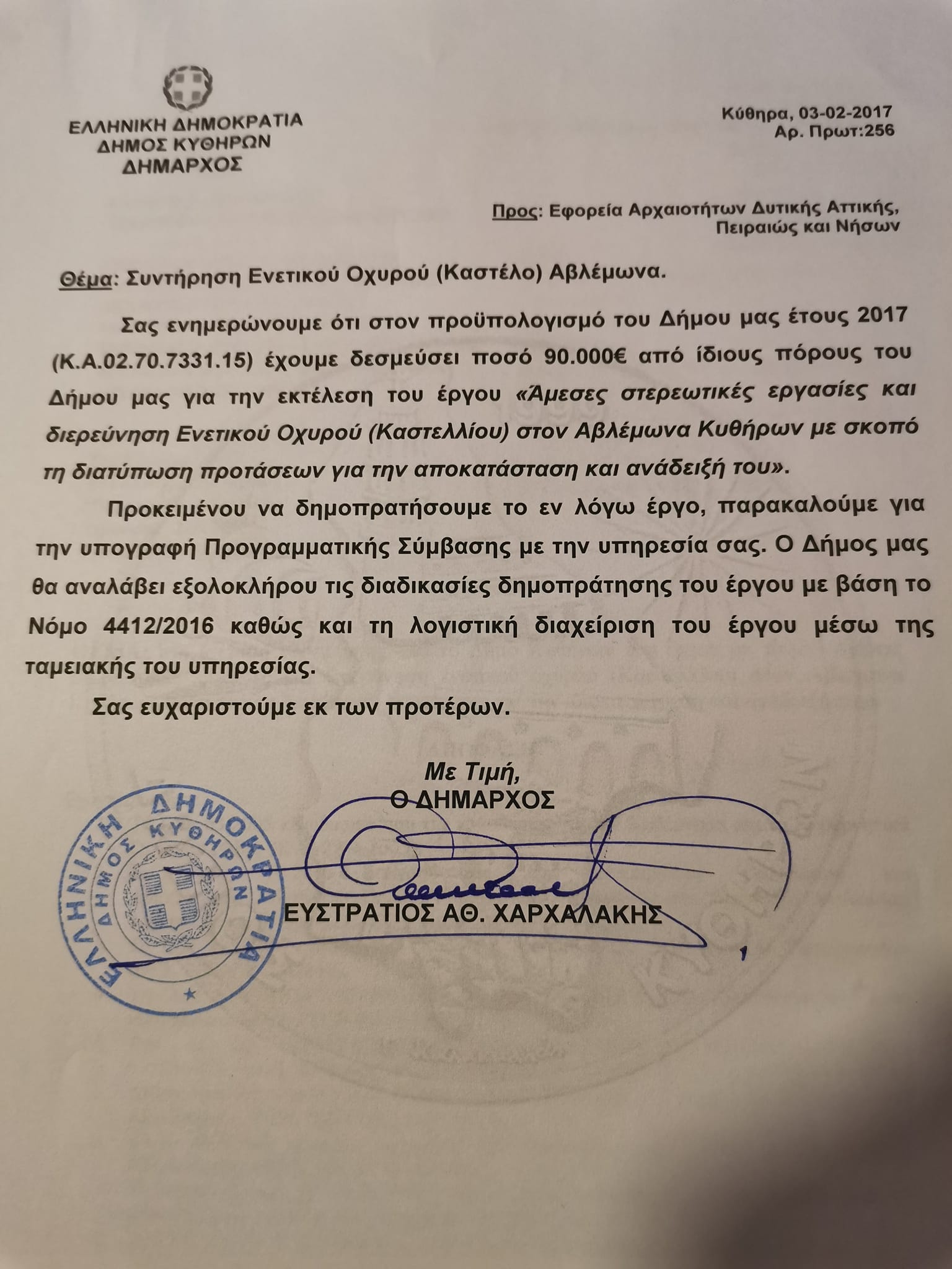 Στις 3/2/2017 έστειλα την με αρ. πρωτ. 256 επιστολή στην Εφορεία Αρχαιοτήτων Πειραιώς. Ενημέρωσα ότι ο Δήμος μας είχε δεσμεύσει ποσό 90.000€ στον Προϋπολογισμό του (το ποσό εντάχθηκε και το 2016 και το 2017 στον ΚΑ 02.70.7331.15) προκειμένου να εκτελεστεί η 1η φάση των διερευνητικών εργασιών και ζήτησα την υπογραφή Προγραμματικής Σύμβασης Πολιτισμικής Ανάπτυξης του άρθρου 100 παρ. 5 του Ν.3852/2010 (αντίστοιχη έχουμε υπογράψει για το Αστικό Σχολείο Ποταμού) προκειμένου να προβούμε στη δημοπράτηση του έργου.