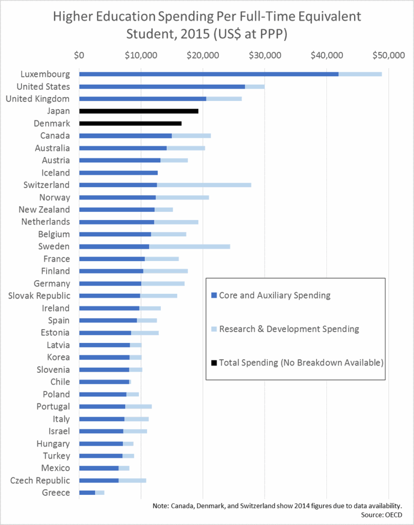 Το αμερικανικό σύστημα τριτοβάθμιας εκπαίδευσης δαπανά σχεδόν 27.000 δολάρια ανά σπουδαστή σε βασικές και βοηθητικές εκπαιδευτικές υπηρεσίες. Το ποσό αυτό περιλαμβάνει τις δαπάνες διδασκαλίας, διοίκησης και βοηθητικών υπηρεσιών όπως φοιτητικές εστίες και χώρους εστίασης. Επιπλέον 3.000 δολάρια ανά σπουδαστή πηγαίνουν στις δαπάνες έρευνας και ανάπτυξης. Μόνο το μικροσκοπικό Λουξεμβούργο, ένα εύπορο μεγάλο δουκάτο στη Δυτική Ευρώπη, ξοδεύει περισσότερο ανά φοιτητή από τις Ηνωμένες Πολιτείες.