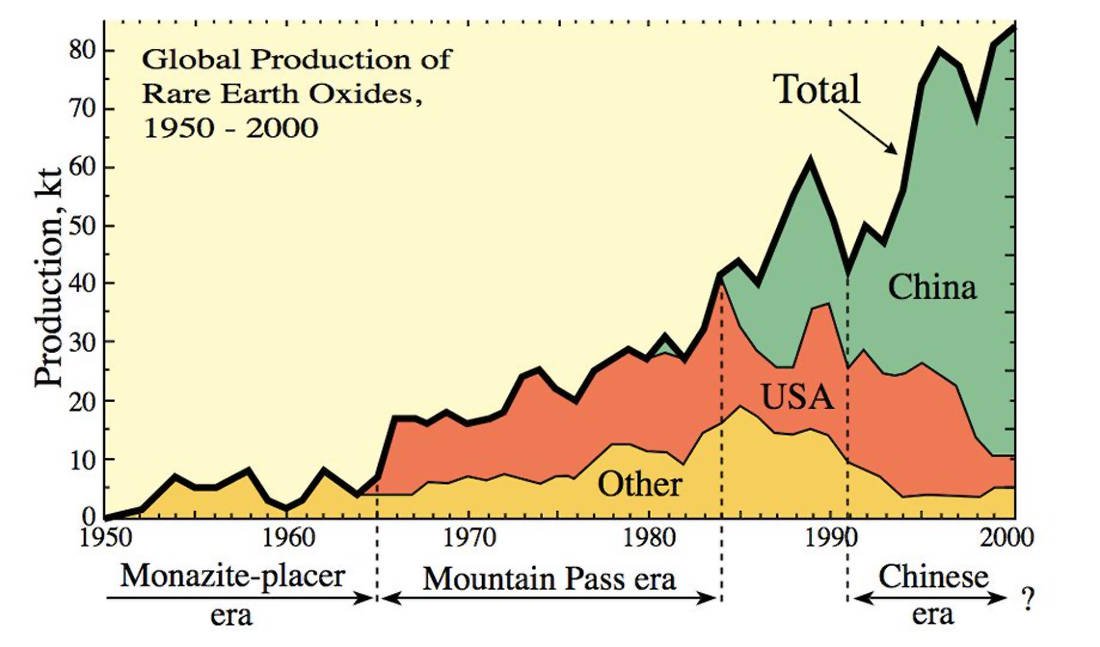 Από τη δεκαετία του 1960 ως και τα τέλη του 1980, μας λέει, η Αμερική ήταν η χώρα που προμήθευε τον πλανήτη με σπάνιες γαίες και όλες τους προέρχονταν μάλιστα από ένα και μόνο ορυχείο στην Καλιφόρνια (Molycorp). Αλλά στα ’90s μπήκε δυναμικά στο παιχνίδι η Κίνα, έριξε τις τιμές και ανάγκασε το αμερικανικό ορυχείο του Mountain Pass να πτωχεύσει το 2002.