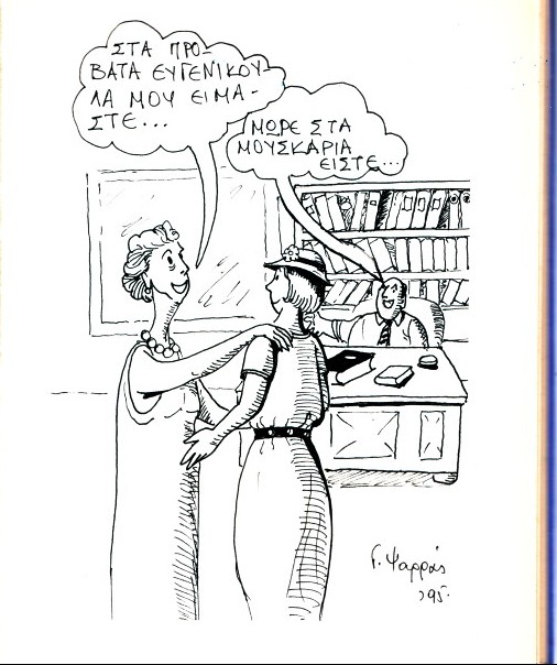 Ο κυρ-Βασίλης από δίπλα είχε ξελιγωθεί. -Μωρέ στα μουσκάρια που σασε λέω είσαστε, μόνο πααίνετε από δω, να κάμω κι εγώ τη δουλειά μου. -Έστω και στα μουσκάρια κυρ-Βασίλη, αφού θα τ’ αρπάξει όπως μας είπες κι αυτά…καλά είναι και τα μουσκάρια. Στο γραφείο του δίπλα είχε μία φωτογραφία της Αγίας Μόνης με τον παπά Μόρμορη στην οξώπορτα. Εγύρισε ο Βασίλης και τον εξάνοιξε και παραμίλιε ξερός στα γέλια: -Έχει κι ακόμα γίνονται, συχωρεμένε μου παπα-Μόρμορη,…έχει σωρός από δαύτα.