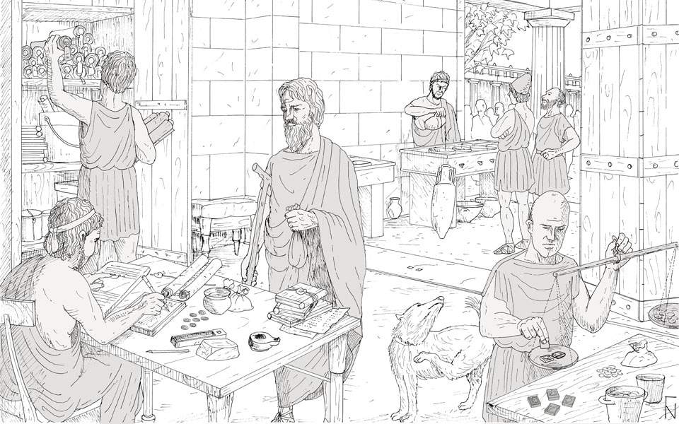 Κάθε πόλη ήταν κράτος και είχε ένα διαφορετικό σύστημα. Κάθε έμπορος που ταξίδευε σε μια πόλη έπρεπε να κάνει συνάλλαγμα, έτσι στην αγορά της υπήρχε πάντα κάποιος μπροστά σε ένα τραπέζι στο οποίο γίνονταν οι συναλλαγές. Και το τραπέζι έγινε τράπεζα. Η σχεδιαστική αναπαράσταση του Γιάννη Νάκα δείχνει το εσωτερικό μιας τράπεζας του 2ου αι. π.Χ. Βλέπουμε τον πελάτη με το πουγκί, τον τραπεζίτη, ένα ζυγό για τη μέτρηση τους βάρους των νομισμάτων, τη λυδία λίθο όπου έτριβαν το νόμισμα ελέγχοντας έτσι την ποιότητα του κράματος.