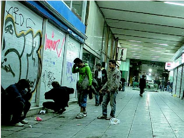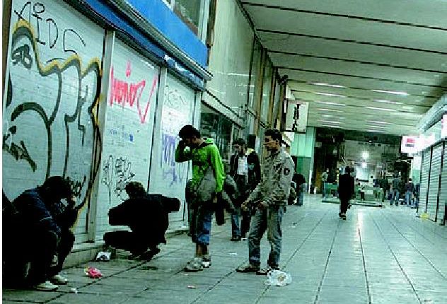 Η κίνηση προς τα Εξάρχεια, λιγοστή. Στα σκαλάκια του Πνευματικού Κέντρου του Δήμου Αθηναίων εξαθλιωμένοι άνθρωποι τρυπιούνται σε κοινή θέα.