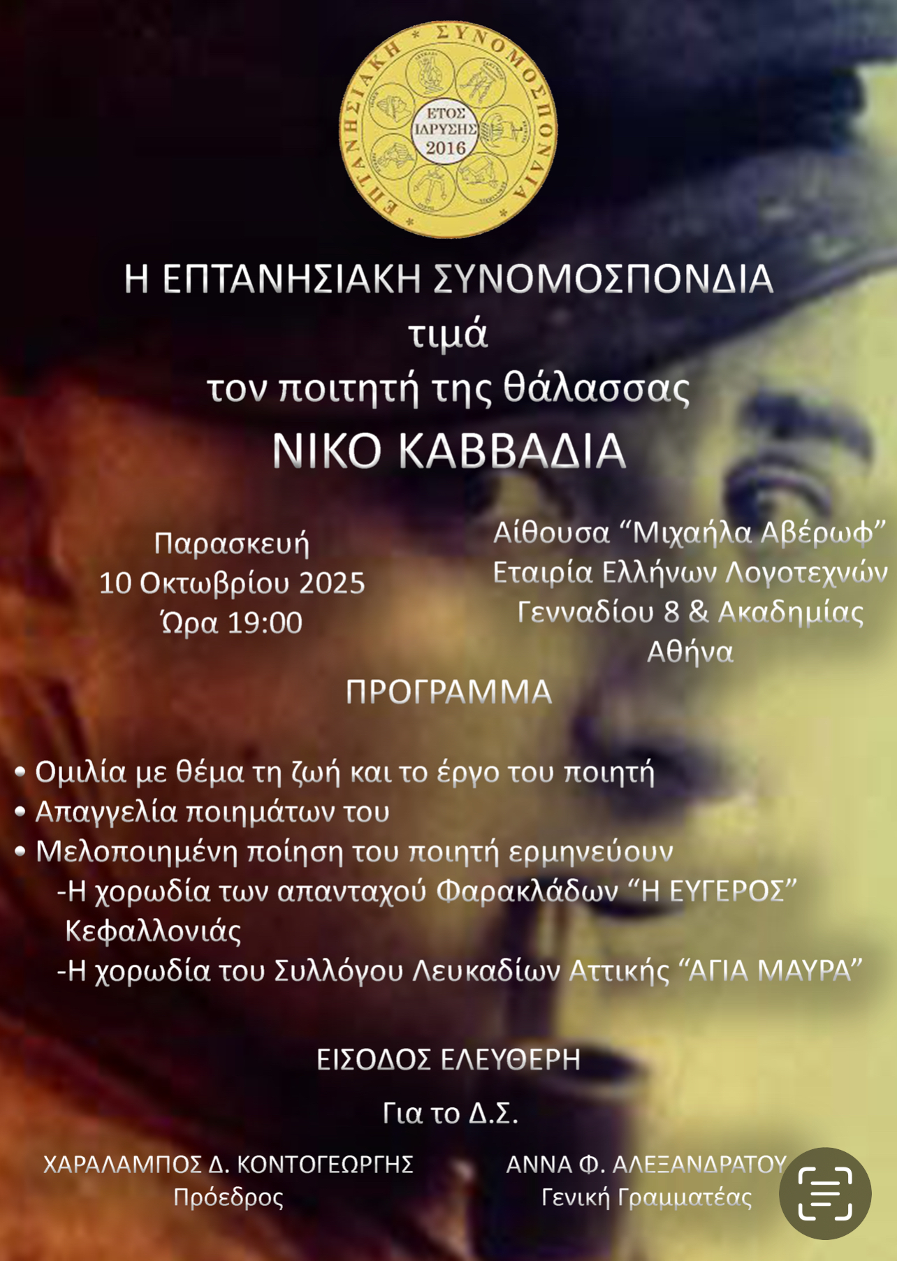 Η ΕΠΤΑΝΗΣΙΑΚΗ ΣΥΝΟΜΟΣΠΟΝΔΙΑ ΤΙΜΑ ΤΟΝ ΠΟΙΗΤΗ ΤΗΣ ΘΑΛΑΣΣΑΣ ΝΙΚΟ ΚΑΒΒΑΔΙΑ