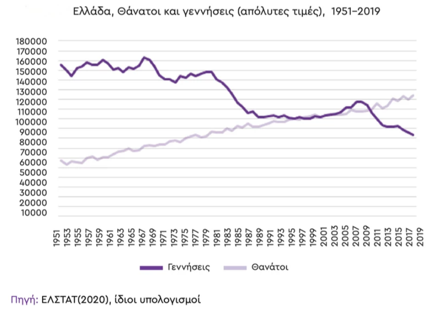 Το έτος 2011, λίγους μήνες μετά την υπογραφή του πρώτου μνημονίου, οι ερευνητές της Ελληνικής Στατιστικής Αρχής βρέθηκαν αντιμέτωποι με ένα σοκαριστικό στοιχείο. Εκτός από τους οικονομικούς δείκτες που είχαν επιδεινωθεί ραγδαία στο σύνολό τους, διαπιστώνουν επίσης ότι ύστερα από πολλές δεκαετίες, οι θάνατοι στην Ελλάδα ξεπέρασαν τις γεννήσεις κατά 4.671 άτομα. Η τάση αυτή μόνο παροδική δεν ήταν, καθώς όχι απλώς συνεχίστηκε ακάθεκτη τα επόμενα χρόνια αλλά επιδεινώθηκε ραγδαία, με αποτέλεσμα το 2020 οι θάνατοι να είναι 46.234 περισσότεροι από τις γεννήσεις! Το ίδιο απογοητευτικά αναμένεται να είναι τα στοιχεία και κατά τη διάρκεια της φετινής γενικής απογραφής του πληθυσμού που θα διεξαχθεί το χρονικό διάστημα από 23 Οκτωβρίου έως και 23 Νοεμβρίου.