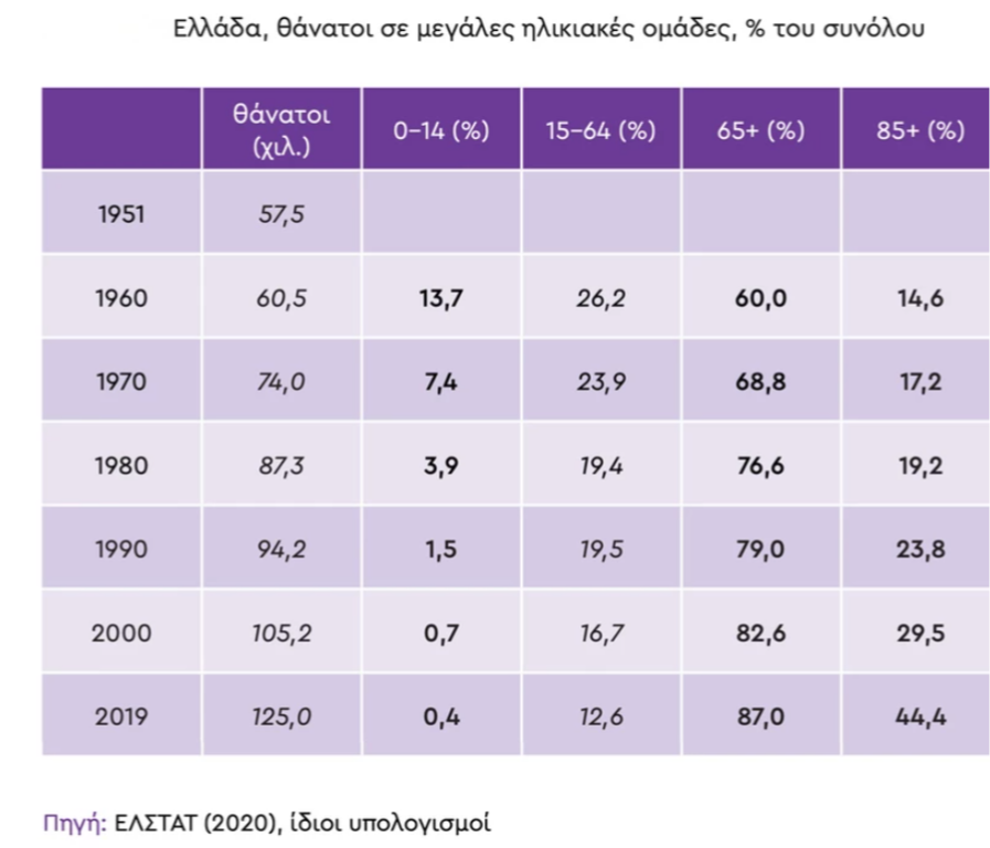 Πίνακας με το ποσοστό των θανάτων σε μεγάλες ηλικιακές ομάδες από το 1951 έως το 2019