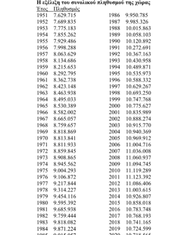 Ο πίνακας δείχνει την εξέλιξη του πληθυσμού από το 1951 έως το 2020