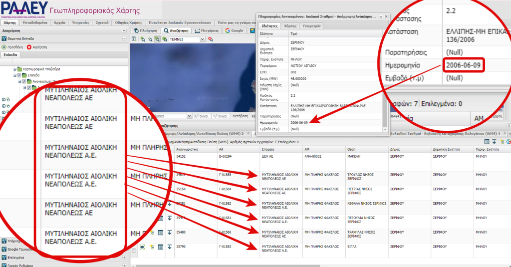 Στα στοιχεία που μας παρέχει ο χάρτης, επιβεβαιώνεται ότι η εταιρεία METLEN (πρώην ΜΥΤΙΛΗΝΑΙΟΣ) υπέβαλε το 2006 έξι αιτήσεις στην ΡΑΑΕΥ για άδειες Παραγωγής Αιολικής Ενέργειας, οι οποίες όμως απορρίφθηκαν από τη ΡΑΑΕΥ.
