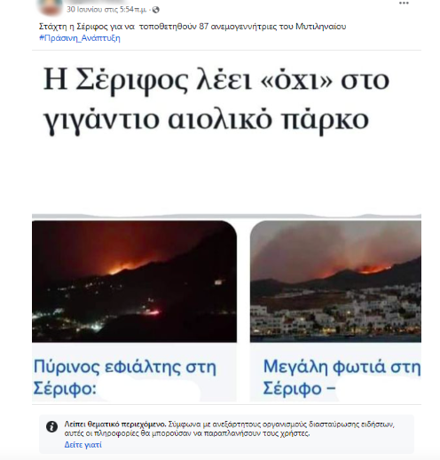Στις 29 Ιουνίου του 2024, το νησί της Σερίφου επλήγη από μία πυρκαγιά, κινητοποιώντας δυνάμεις της Πυροσβεστικής Υπηρεσίας. Σε αυτό το πλαίσιο, στις 30 Ιουνίου του 2024 εμφανίστηκε σημαντικός αριθμός αναρτήσεων στο Facebook, οι οποίες συνοδεύτηκαν από τον ισχυρισμό ότι το νησί τυλίχθηκε στις φλόγες προκειμένου να τοποθετηθούν 87 ανεμογεννήτριες της εταιρείας Metlen Εnergy & Metals (πρώην MYTILINEOS). Ωστόσο, όπως θα δούμε στη συνέχεια, κάτι τέτοιο δεν ισχύει.