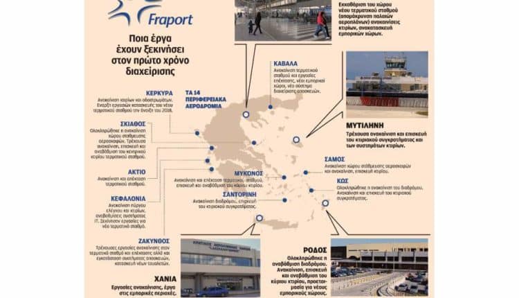 Αν και οι κύριες κατασκευαστικές εργασίες θα αρχίσουν μετά τον Σεπτέμβριο προκειμένου να ελαχιστοποιηθούν τα προβλήματα για το επιβατικό κοινό εν μέσω της καλοκαιρινής σεζόν. Σύμφωνα με όσα ανακοίνωσε προ ημερών ο επικεφαλής της γερμανικής Fraport AG, και μητρικής της Fraport Greece, δρ Στέφαν Σούλτε, στόχος είναι τα μισά από τα 14 αεροδρόμια να είναι έτοιμα το 2019 και συγκεκριμένα της Ζακύνθου, της Καβάλας και των Χανίων πριν από το καλοκαίρι του 2019, ενώ της Κεφαλονιάς, του Ακτίου, της Σάμου και της Σκιάθου μετά το καλοκαίρι του 2019. Για το 2020 προγραμματίζεται η ολοκλήρωση των έργων σε Μυτιλήνη, Κω, Ρόδο και Σαντορίνη, ενώ πριν από το καλοκαίρι του 2021 επιδιώκεται να τελειώσουν τα έργα σε Θεσσαλονίκη, Κέρκυρα και Μύκονο.