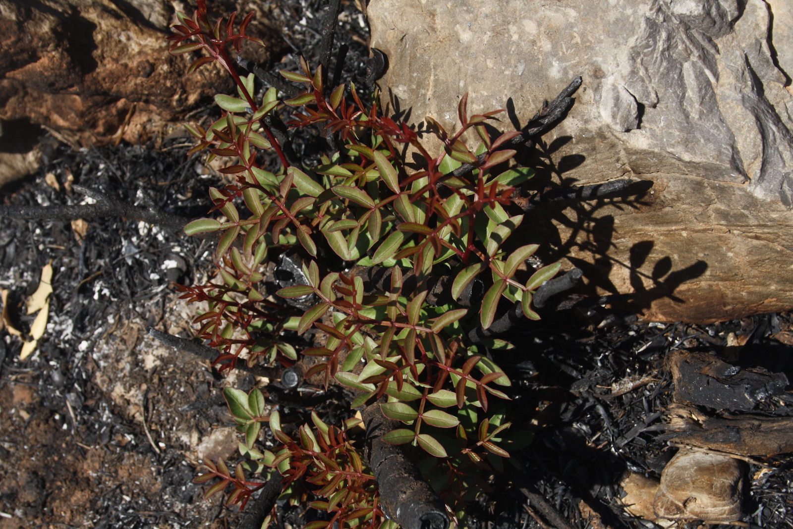 Η φύση, λοιπόν, έκανε κι εδώ το θαύμα της. Είδαμε νεαρά βλαστάρια από σκίνα που είχαν ήδη μέγεθος πάνω από 10 εκ. ενώ το ίδιο περίπου ήταν και τα βλαστάρια από τα πουρνάρια. Η αλήθεια είναι ότι παρακολουθούσαμε τους τοίχους που αποκαλύφθηκαν μέσα από την καμένη πυκνή άγρια βλάστηση και ήταν εντυπωσιακό το πόσα μέτρα κάλυπταν αυτοί οι τοίχοι, με ύψος που έφθανε το 1,5μ, οι οποίοι ήταν γνωστοί ως ξεροτρόχαλα, αλλά, παρά το γεγονός ότι το μόνο τους υλικό ήταν οι άφθονες πέτρες, η μαστοριά των ντόπιων τεχνητών ήταν τέτοια που τα έργα τους έμειναν όρθια στους αιώνες για να θυμίζουν στους δασάρχες μας ποίες ήταν οι ανθρωπογενείς δραστηριότητες που δεν αναγνωρίζουν και πόσο μόχθο κουβαλούσαν οι κατασκευές αυτές.