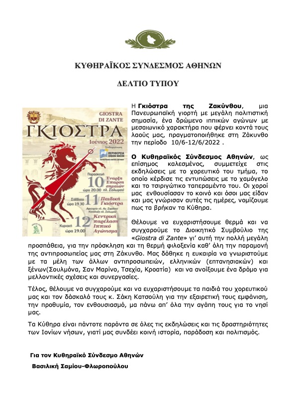- Η Γκιόστρα της Ζακύνθου- ΔΤ Κυθηραϊκός Σύνδεσμος Αθηνών