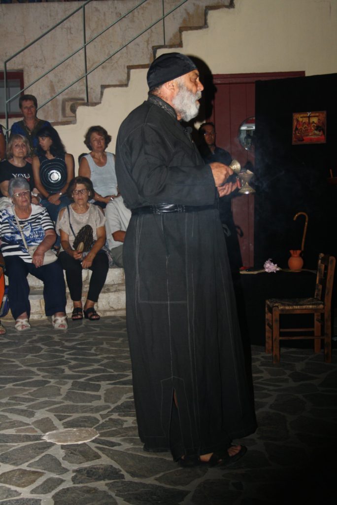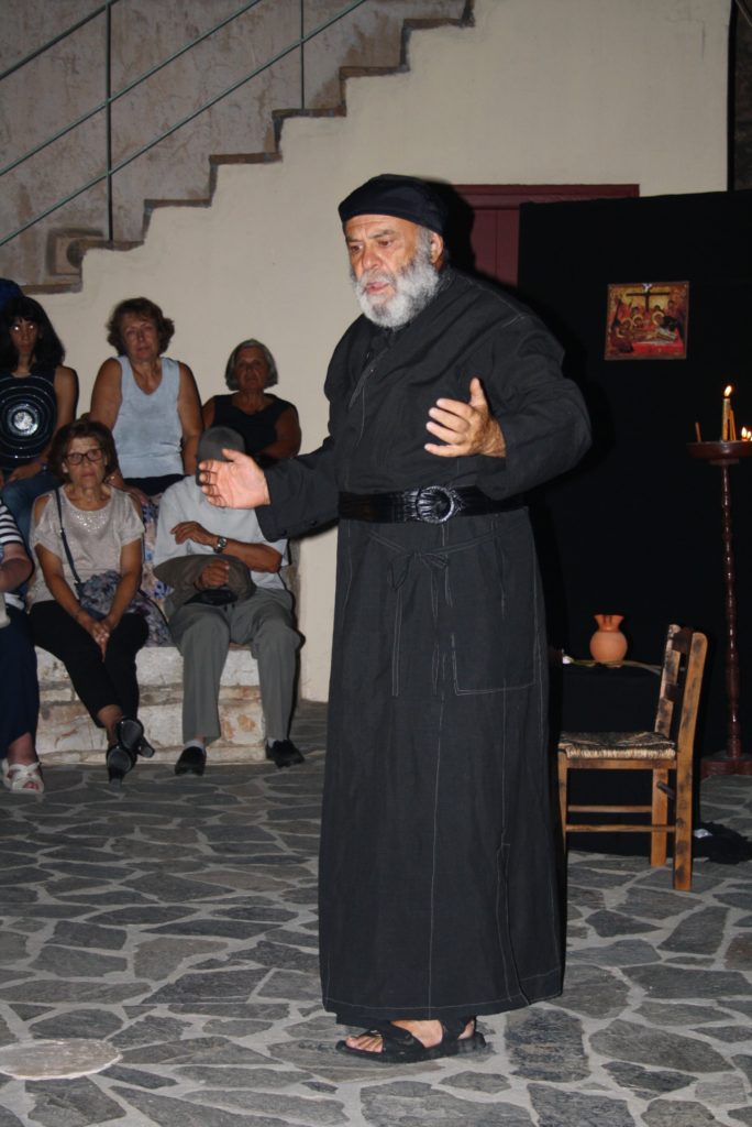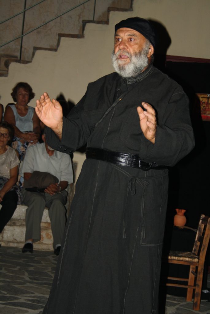 Η έκπληξη της παρουσίασης αυτού του δύσκολου έργου ήταν ο ….ηθοποιός Γιώργης Κασιμάτης-Δρυμωνιάτης, (οικονομολόγος, ορκωτός ελεγκτής, επιχειρηματίας, ποιητής, συγγραφέας, παραγωγός γεωργικών προϊόντων και τώρα ηθοποιός) που πήρε πάνω του όλες τις δυσκολίες της απόδοσης ενός μονόπρακτου στο οποίο ήταν ο μοναδικός ηθοποιός στον εμβληματικό ρόλο του μοναχού Διονυσίου, ο οποίος περιέγραφε τις αντιφάσεις από δύο διαφορετικές κοινωνίες, αυτής των αγωνιζομένων Ελλήνων για την ελευθερία και ειδικά τους πολιορκημένους του Μεσολογγίου και αυτής των «βολεμένων» στην ασφαλή υπό την Αγγλική προστασία Ζάκυνθο.