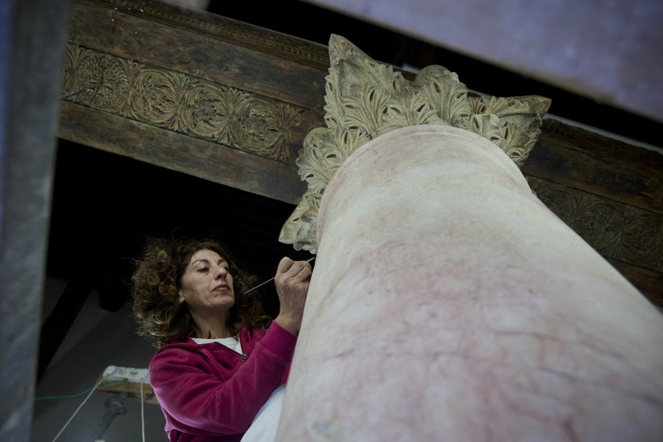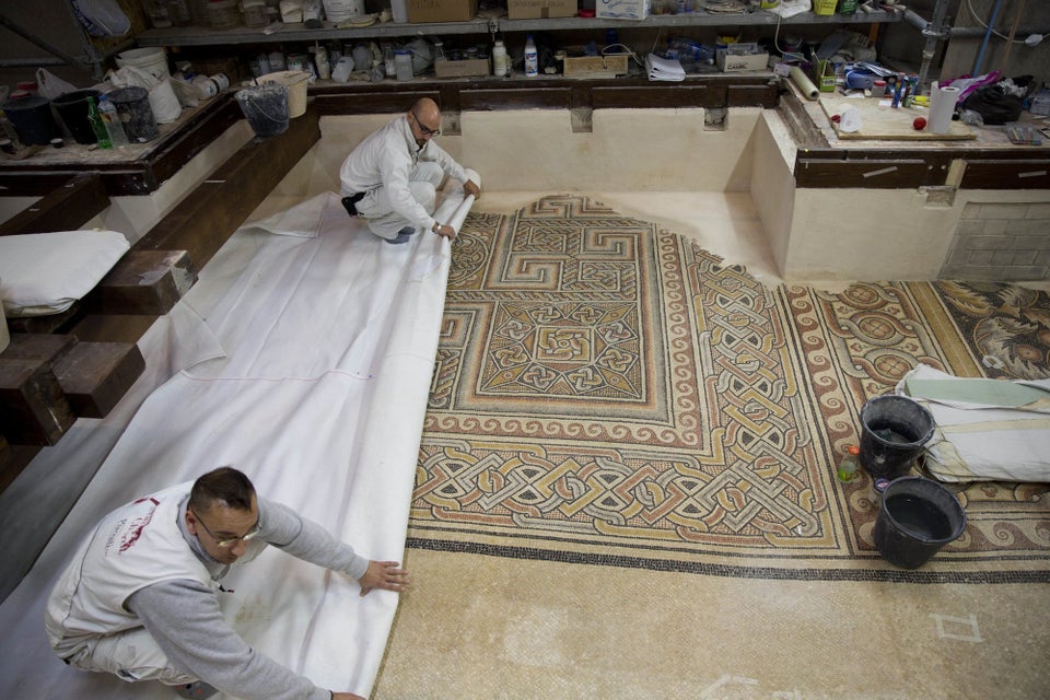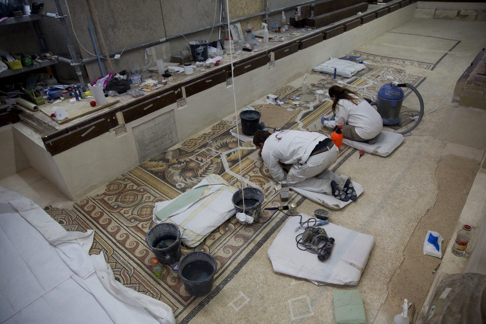 Θα μπορούσε κανείς να πει πως η μεγαλύτερη πρόκληση για τους μηχανικούς ήταν η αποκατάσταση του μωσαϊκού που κοσμεί τον τοίχο που είχε φθαρεί έντονα σε έκταση τουλάχιστον 2.000 τετραγωνικών μέτρων. Μέχρι στιγμής, η αποκατάσταση έχει ολοκληρωθεί σε 120 τετραγωνικά μέτρα. Οι εργάτες πρόκειται επίσης να αποκαταστήσουν το μωσαϊκό του δαπέδου.