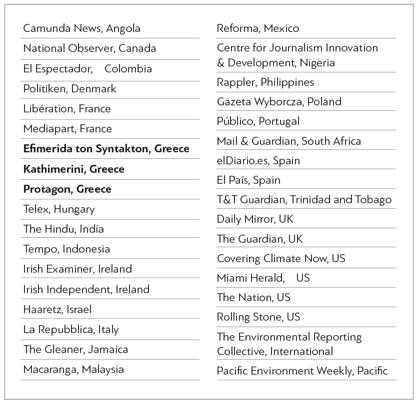 Οι 30 εφημερίδες και οργανισμοί μέσων ενημέρωσης σε πάνω από 20 χώρες, μεταξύ των οποίων το Protagon, που συνυπογράφουν το κείμενο: