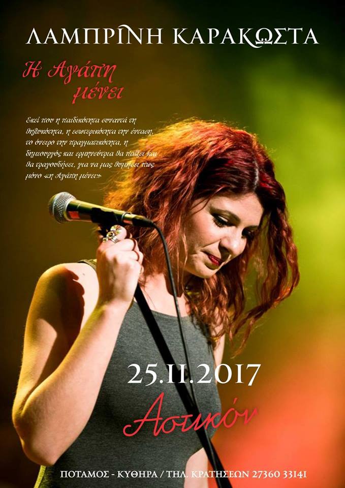 Όλα τα πρόσωπα της Λαμπρινής Καρακώστα γίνονται ένα και παίρνουν σχήμα και ήχο στη σκηνή του ”Αστικόν” στα Κύθηρα.Έχοντας ολοκληρώσει την τετραετή συνεργασία της με τον Σωκράτη Μάλαμα όπου κέρδισε τις εντυπώσεις ως ερμηνεύτρια, η Λαμπρινή μας συστήνεται πλέον και ως δημιουργός, λίγο πρίν τη κυκλοφορία του πρώτου προσωπικού της άλμπουμ.Με την κλασσική της κιθάρα και το μεταλόφωνο της, πότε μας συγκινεί με την ευαισθησία της και πότε με τα κρουστά της, μας ξεσηκώνει.