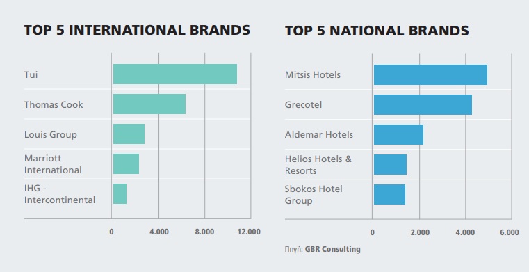 Στην πεντάδα των μεγαλύτερων εγχώριων brands βρίσκονται, με βάση τα στοιχεία της GBR Consulting, καταρχάς ο όμιλος Μήτση με συνολικά 18 μονάδες και σχεδόν 5.900 δωμάτια και ακολουθούν η Grecotel με 25 ξενοδοχεία και κοντά στα 5.100 δωμάτια και η Aldemar με 7 ξενοδοχεία resorts και 2.582 δωμάτια. Η Helios Hotels and Resorts έχει στο χαρτοφυλάκιό της 4 μονάδες στην Κρήτη, τα «Nafplia Palace» και «Amphitryon Hotel» στο Ναύπλιο και το «Grand Resort Lagonissi» στην Αττική, ενώ το top 5 των μεγάλων εγχώριων παικτών συμπληρώνει ο όμιλος Σμπώκου με 6 ξενοδοχεία σε Ρόδο και Κρήτη.