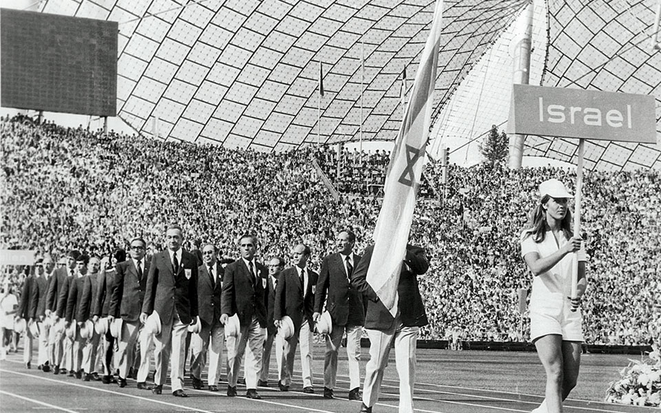 Η ισραηλινή ομάδα παρελαύνει στο Ολυμπιακό Στάδιο του Μονάχου κατά την τελετή έναρξης των Ολυμπιακών Αγώνων του 1972.