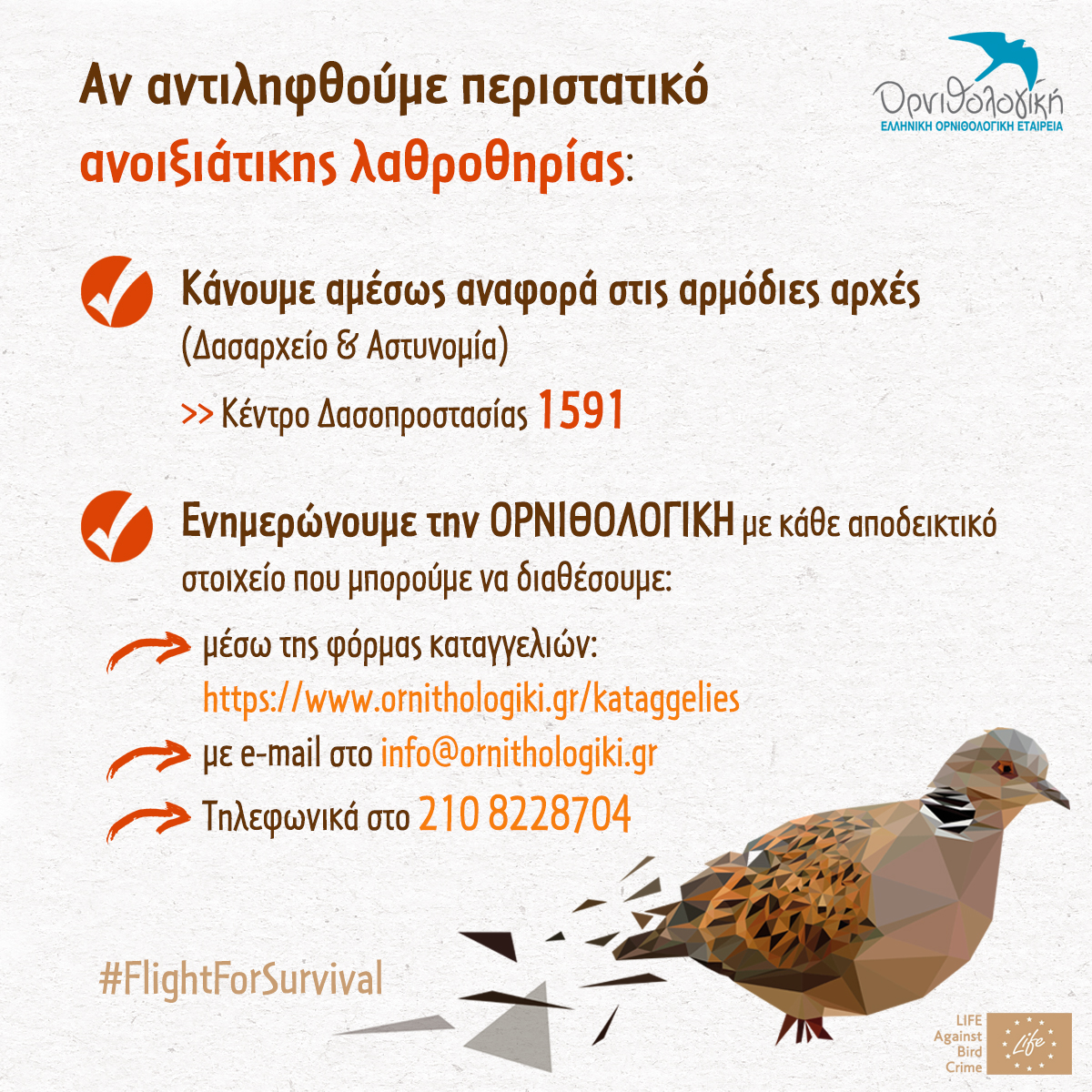 – Ενημερώστε την ΟΡΝΙΘΟΛΟΓΙΚΗ: 210 8228704 & 210 8227937, info@ornithologiki.gr με κάθε αποδεικτικό στοιχείο που μπορείτε να διαθέσετε.