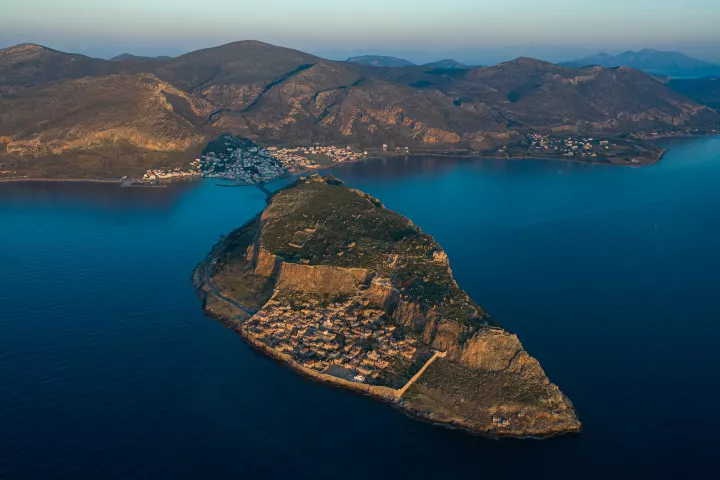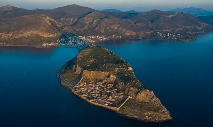 Την εποχή της Βυζαντινής Αυτοκρατορίας, και συγκεκριμένα τον 6ο αιώνα μ.Χ., ο αυτοκράτορας Ιουστινιανός αντιμετωπίζει πολλές αναπάντεχες καταστροφές σε πολλά μέτωπα. Επιδρομές αντίπαλων λαών που διψούν για λεηλασίες και κατακτήσεις, καθώς και η ανεξέλεγκτη οργή της φύσης (αλλεπάλληλοι σεισμοί), προκαλούν σοβαρές ζημιές στην επικράτειά του. Στην Λακωνία, οι κάτοικοι της Λακεδαίμονος (της αρχαίας Σπάρτης), εγκαταλείπουν την πόλη τους προσπαθώντας να ξεφύγουν από τις επιθέσεις των Άβαρων και των Βησιγότθων, γερμανικών φυλών που μάστιζαν τότε την Ευρώπη. Καταφύγιό τους; Η βραχονησίδα που κρεμόταν από μια κλωστή.