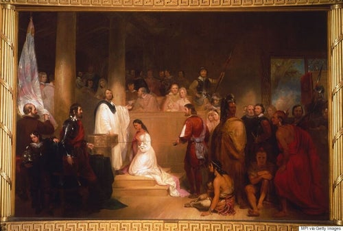 Η γαμήλια τελετή της Ποκαχόντας, πλέον Ρεββέκας, και του Τζον Ρολφ (πίνακας του Henry Brueckner, γύρω στο 1855)