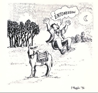 -Ενόμισα βρε Αντώνακα, πως είσουνε ο κουρσάρος. Αφού δεν τα κακάρωσα, δόξα νάχει ο ʼΑγιος. Τάχε στυλώσει βλέπεις ο γάιδαρος κι ούτε μπροστά επάαινε, ούτε πίσω…