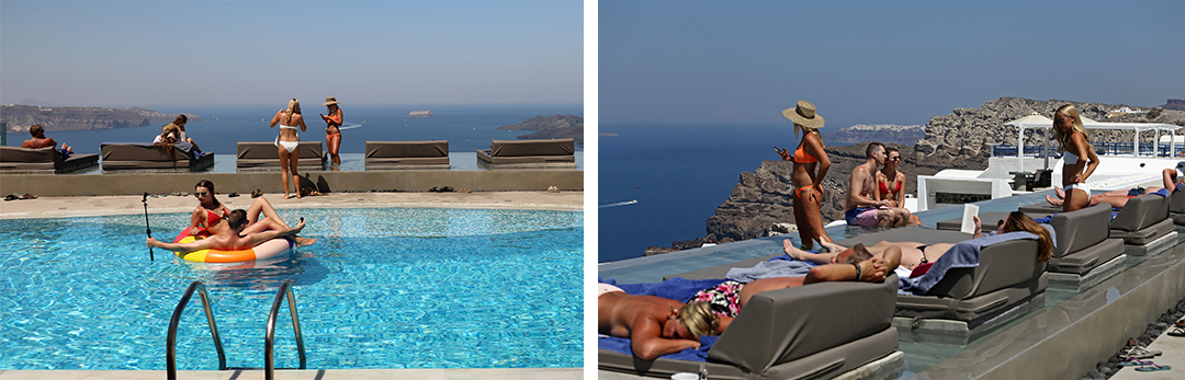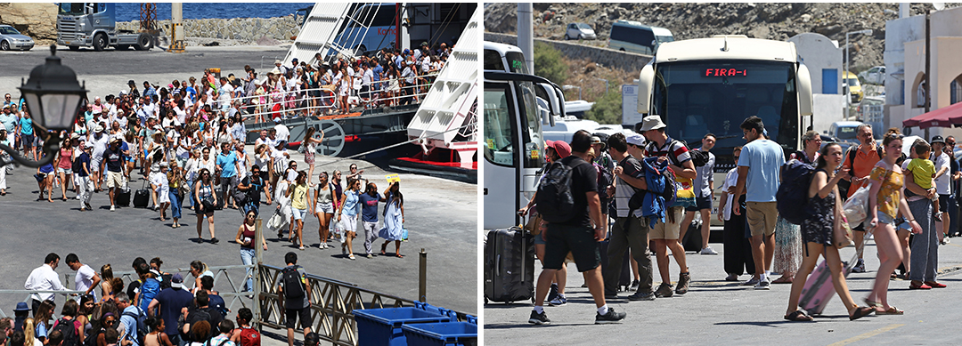 Λιμάνι Αθηνιού, ώρα 11 το πρωί. Οι «λάντζες» συνεχίζουν να μεταφέρουν κόσμο από τα τρία κρουαζιερόπλοια που επισκέπτονται σήμερα το νησί. Το τελεφερίκ στα Φηρά είναι σχεδόν άδειο, οι περισσότεροι κατευθύνονται εδώ για να μπουν στα πούλμαν. Εκείνη την ώρα φθάνει και το πρώτο πλοίο της γραμμής από Κρήτη. Με το που ανοίγει η μπουκαπόρτα, ξεχύνεται ένα πλήθος, ίσως 1.500 ή 2.000 άτομα. Ελάχιστοι κρατούν βαλίτσες. Σχεδόν όλοι κατευθύνονται στα πούλμαν και στα βανάκια που περιμένουν σε κάθε διαθέσιμο σημείο. Κάποια παιδιά φορούν το χαρακτηριστικό «βραχιολάκι» των all inclusive ξενοδοχείων. Τα πούλμαν γεμίζουν, οι δρόμοι πήζουν και πάλι.