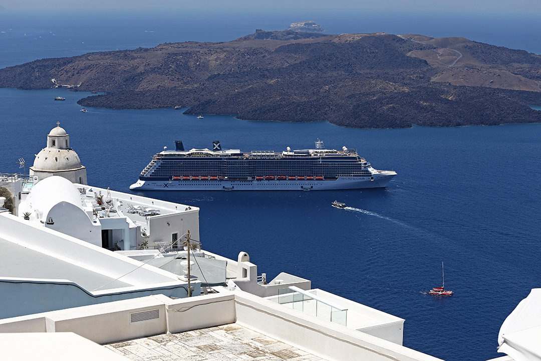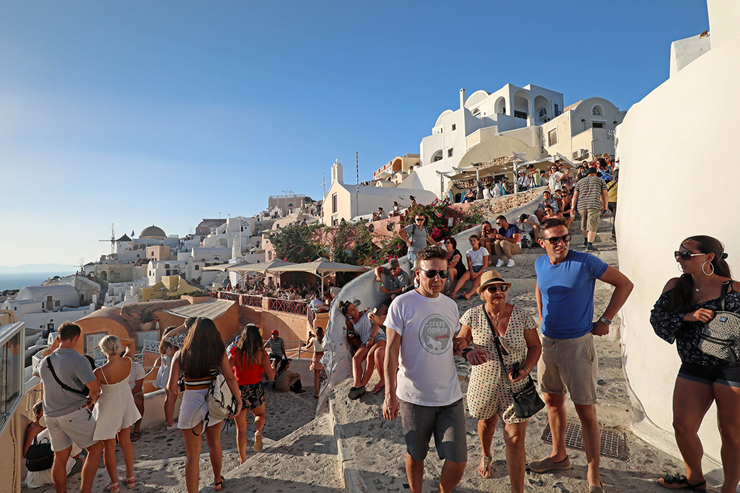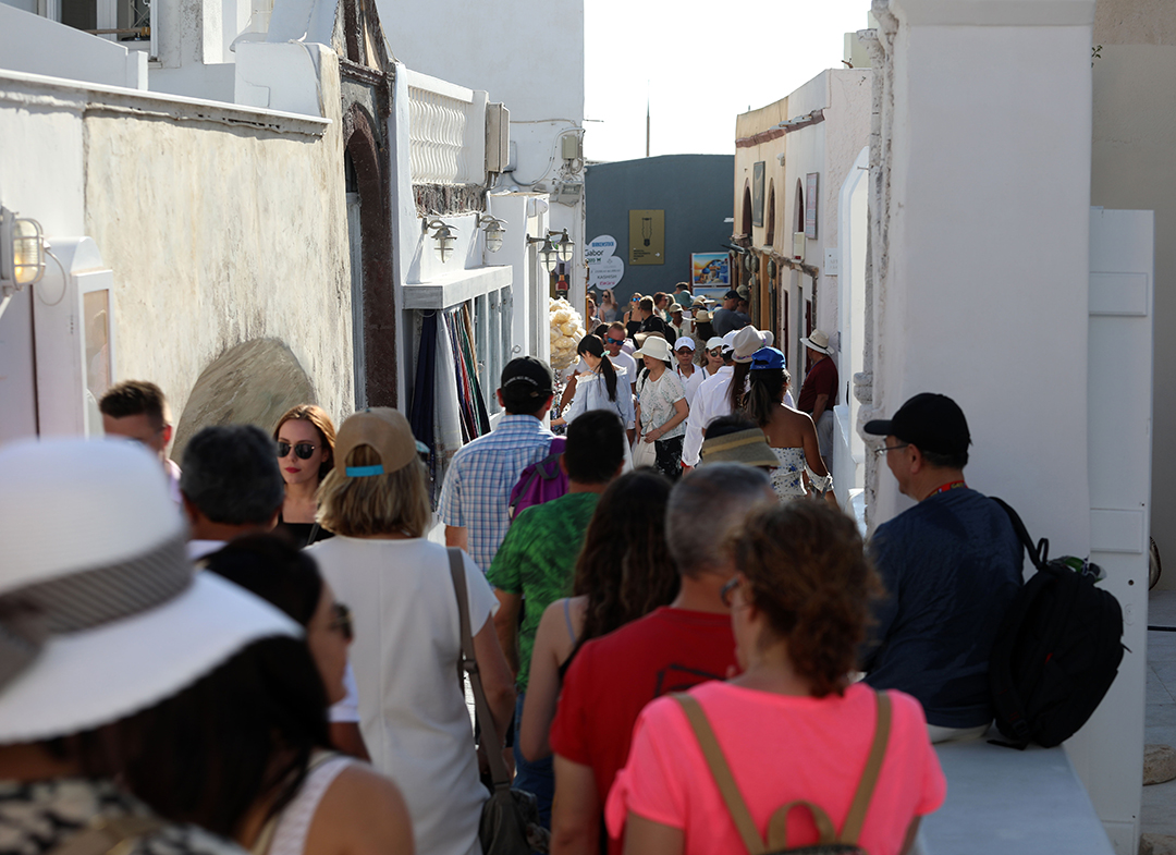 Οία, ώρα 9 το πρωί. Το χωριό έχει μόλις αρχίσει να ξυπνά, τα περισσότερα μαγαζιά είναι ακόμα κλειστά. Και τότε, φθάνει η πρώτη ομάδα. Περίπου 10-15 άτομα, όλοι με κάποιο αυτοκόλλητο στο στήθος που δηλώνει την ομάδα και την κρουαζιέρα από την οποία προέρχονται. Μαζί τους, μια οδηγός που κρατά ψηλά ένα σημαιάκι. Στέκονται στη μικρή πλατεία στην είσοδο για μια πρόχειρη «εισαγωγή». Αμέσως έρχεται το δεύτερο γκρουπ. Το τρίτο. Το τέταρτο. Το πέμπτο. Μέσα σε μια ώρα επικρατεί το αδιαχώρητο. Εκατοντάδες άνθρωποι συνωστίζονται στα στενά σοκάκια, κινούνται σημειωτόν σε ουρές. Δεν μπορείς να προχωρήσεις πιο γρήγορα, ούτε και να σταματήσεις. Για μια απόσταση 100-200 μέτρων χρειάζεσαι δέκα λεπτά. Δεν θες να σκέφτεσαι τι θα συμβεί αν για οποιονδήποτε λόγο προκληθεί πανικός.