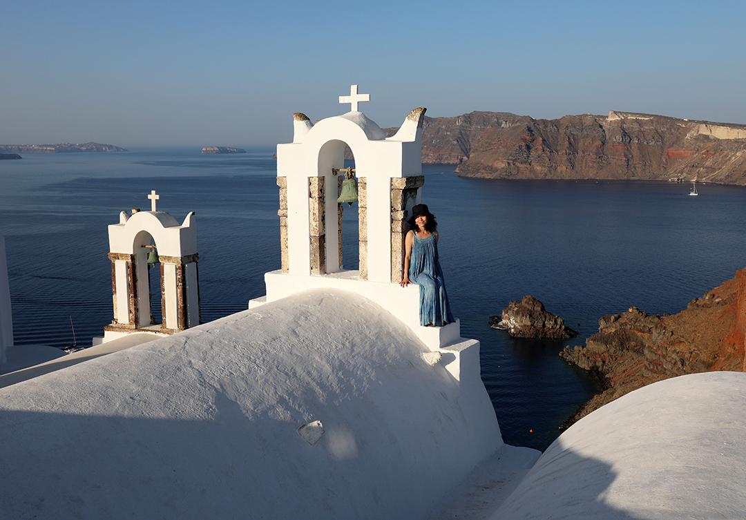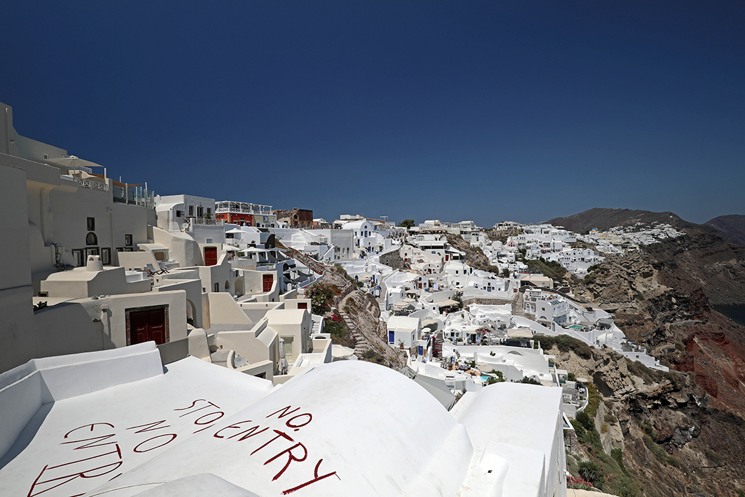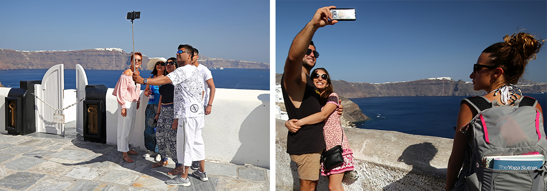 Οία, ώρα 7 το πρωί. Τα μαγαζιά είναι ακόμα κλειστά, ο κόσμος στα σοκάκια του μαγευτικού χωριού λιγοστός. Ενα ζευγάρι σκαρφαλώνει προσεκτικά σε έναν μαντρότοιχο και ανεβαίνει στη θολωτή οροφή ενός σπιτιού. Λίγο πιο εκεί, μια φωτογράφος τούς δίνει οδηγίες. Αγκαλιάζονται, φιλιούνται, αλλάζουν πόζες, με θέα το Αιγαίο. Πιο πίσω, μια Κινέζα νύφη έχει σκαρφαλώσει σε μια εκκλησία, δίπλα στον μπλε τρούλο και ανεμίζει τα τούλια από το φόρεμά της, πάντα υπό τις οδηγίες του φωτογράφου της. Απλώνει το χέρι, πιάνει το σχοινί της καμπάνας, τη χτυπά. Ενας υπάλληλος καθαριότητας βρίζει, καθώς βρίσκει πεταμένες σακούλες με μπάζα μέσα σε ένα στενάκι.