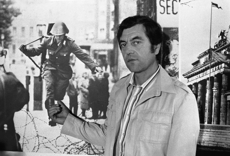 O Kόνραντ Σούμαν, πρώην στρατιώτης της Ανατολικής Γερμανίας, δείχνει τη φωτογραφία του από τις 15 Αυγούστου 1961, όταν έγινε ο πρώτος άνθρωπος που απέδρασε από το Τείχος του Βερολίνου / Φωτογραφία αρχείου: ΑΡ
