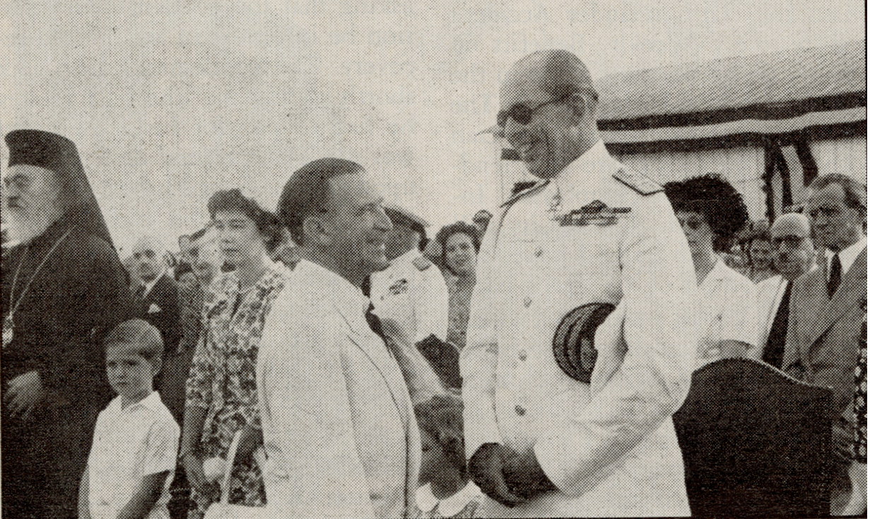 Ο Στέφανος Ζώτος στα πρώτα γενέθλια της ΤΑΕ τον Σεπτέμβριο του 1947 στο αεροδρόμιο του Ελληνικού, δίπλα στον βασιλιά Παύλο. Στα αριστερά η βασίλισσα Φρειδερίκη, ο διάδοχος Κωνσταντίνος και ο αρχιεπίσκοπος Δαμασκηνός (Αρχείο TWA, The State Historical Society of Missouri)