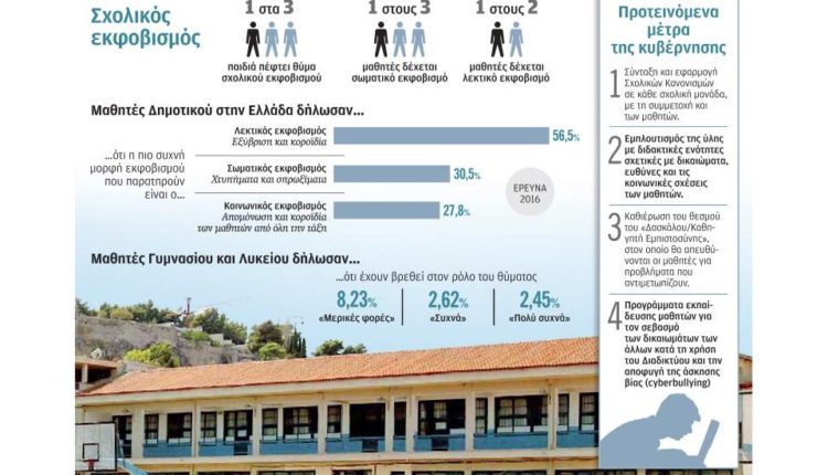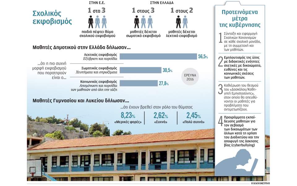 Ενα στα τρία παιδιά στην Ευρωπαϊκή Ενωση πέφτει θύμα εκφοβισμού στο σχολείο. Σύμφωνα με στοιχεία που είχαν γίνει γνωστά στο 5ο Συνέδριο του Ευρωπαϊκού Δικτύου κατά του Σχολικού Εκφοβισμού, στην Ελλάδα ένας στους τρεις μαθητές δέχεται σωματικό εκφοβισμό, ενώ λεκτικό εκφοβισμό υφίστανται περισσότεροι από τους μισούς μαθητές. Είναι χαρακτηριστικό ότι, όπως αναφέρεται σε μελέτη του Οργανισμού Ερευνας και Ανάλυσης διαΝΕΟσις, που βασίστηκε στα ποσοτικά και ποιοτικά αποτελέσματα του PISA του 2015, τo 16,7% των Ελλήνων μαθητών δήλωσε πως έχει υποστεί κάποιας μορφής μπούλινγκ κατά τη διάρκεια του τελευταίου μήνα πριν από την έρευνα, ενώ το 4,3% δήλωσε πως έχει δεχθεί σωματική βία τον τελευταίο μήνα στο σχολείο (ακριβώς ίδιο ποσοστό με τον μέσο όρο του ΟΟΣΑ). Η μεγαλύτερη έρευνα για τον σχολικό εκφοβισμό στην πρωτοβάθμια και δευτεροβάθμια εκπαίδευση στην Ελλάδα είχε πραγματοποιηθεί το 2016 από το υπουργείο Παιδείας (Αρτινοπούλου, Μπαμπάλης, Νικολόπουλος). Οι μαθητές δημοτικού στην Ελλάδα δήλωσαν ότι η πιο συχνή μορφή εκφοβισμού που παρατηρούν είναι ο λεκτικός εκφοβισμός (56,5%), που περιλαμβάνει την εξύβριση και την κοροϊδία, ακολουθεί ο σωματικός εκφοβισμός (30,5%), που περιλαμβάνει χτυπήματα – σπρωξίματα, και τέλος ο κοινωνικός εκφοβισμός, η απομόνωση και η κοροϊδία των μαθητών από όλη την τάξη (27,8%). Στη δευτεροβάθμια εκπαίδευση, το 8,23% των μαθητών έχει βρεθεί «Μερικές φορές» στον ρόλο του θύματος, ενώ το 2,62% και το 2,45% των μαθητών αντιστοίχως βρίσκεται «Συχνά» και «Πολύ συχνά».